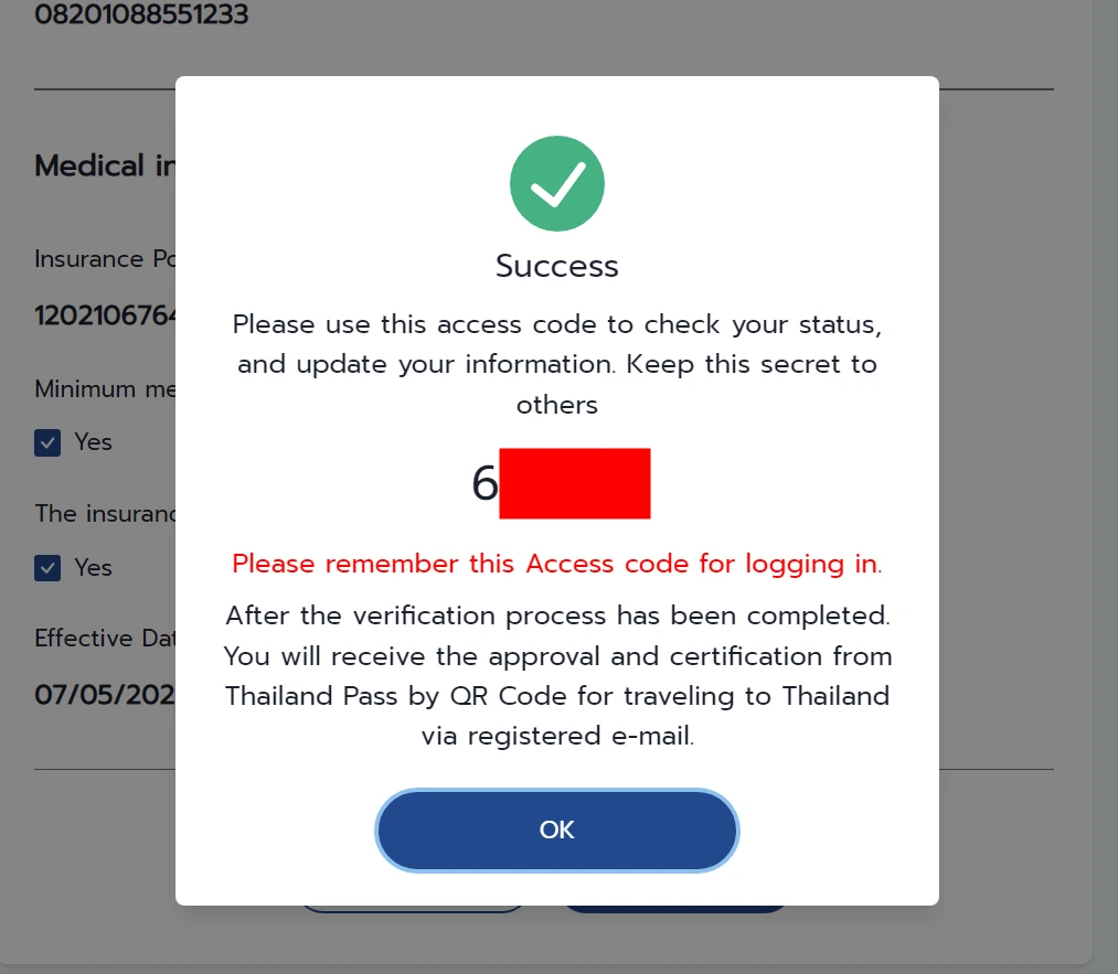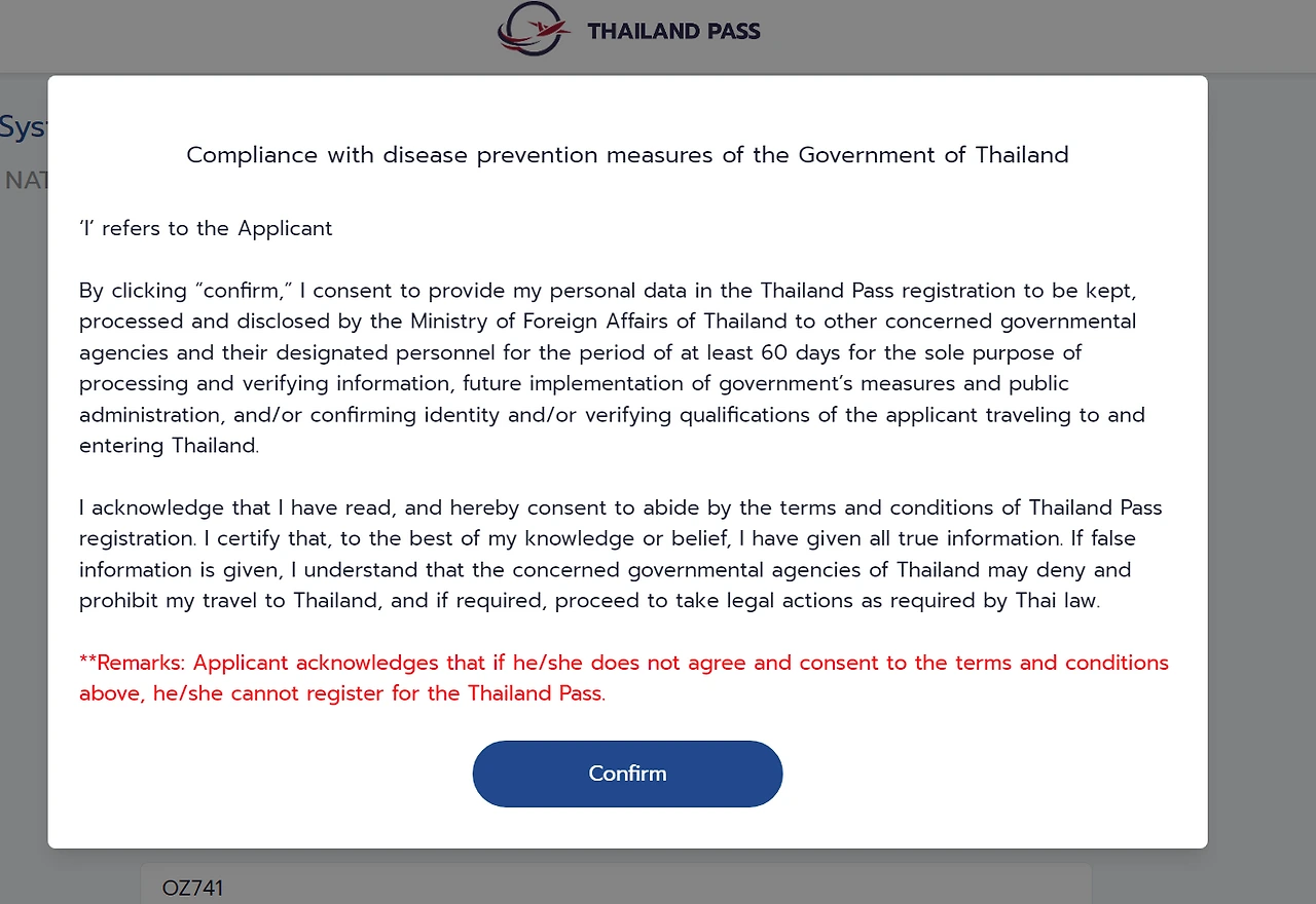"확인"을 클릭함으로써, 나는 태국 외교부가 보관, 처리 및 공개하는 태국 패스 등록의 내 개인 데이터를 정보 처리 및 검증의 유일한 목적을 위해 적어도 60일 동안 다른 관련 정부 기관 및 그들의 지정 담당자에게 제공하는 것에 동의한다.정부의 조치 및 공공 행정의 이행 및/또는 태국 여행 및 입국 신청자의 신원 확인 및/또는 자격 확인.