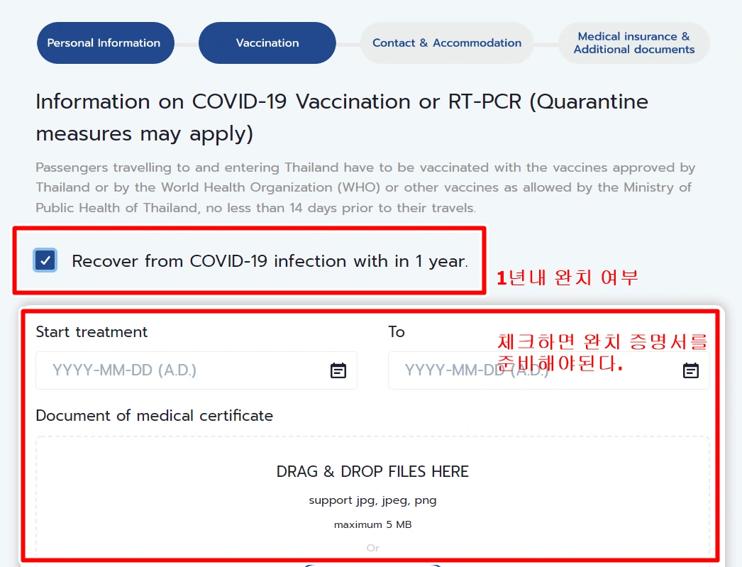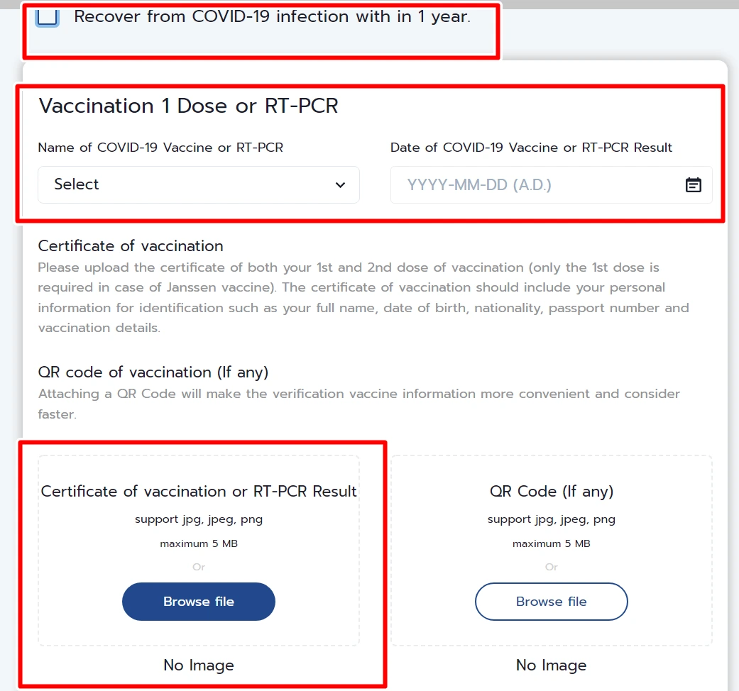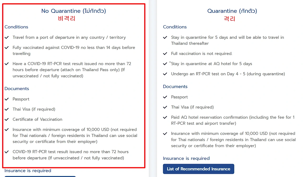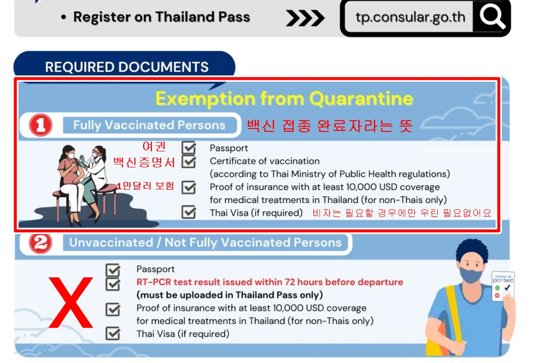 4.1 자격이 있는 사람은 (1) 완전 백신 접종을 받은 사람 및 (2) 미접종/완전 백신 접종을 받은 사람 중 등록 중 태국 패스로 이동하기 72시간 이내에 발급된 RT-PCR 테스트 결과를 첨부한 사람이다.