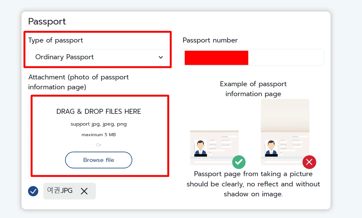 여권 종류는 Ordinary Passport (보통 여권)로 하시면 됩니다. 옆에 여권번호 입력하시고요