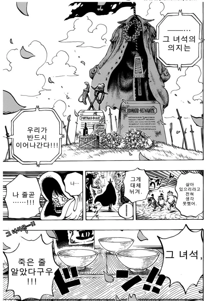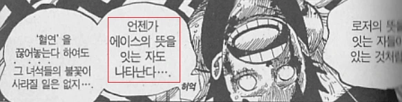 그러니까 에이스가 죽었을 때 독자들은 깜짝 놀랐지만 작가에게는 에이스는 처음부터 죽을 것으로 계획해 둔 캐릭터였던 겁니다. 그래서 "에이스가 이렇게 하면 살 수 있었다, 한 명 구하자고 정상결전을 하냐" 이렇게 답답해하셔도 소용이 없습니다. 등에다가 십자가 문신해 놨는데요 뭘.