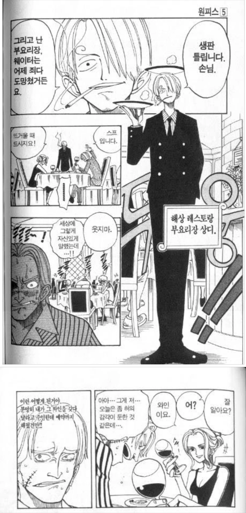 상디가 요리복이 아니라 늘 양복을 입고 있는 걸 생각하면 왜 요리사일 뿐 아니라 구제 담당 집사인지 느낌이 옵니다. 고대교회에서 집사는 가난한 사람들을 위해서 음식을 마련하고 서빙하는 역할을 했습니다. 그래서 상디는 (자기는 아니라고 하면서도) 웨이터의 옷을 입고 굶은 사람만 보면 안타까워서 밥을 먹이고 보는 것입니다.
