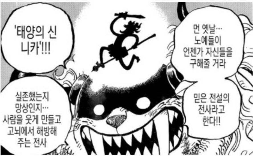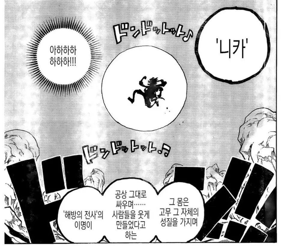 어떤 분들은 니카와 사람사람 열매가 급조한 설정이라고 생각하시기도 하는데 제 가설에 따르면 매끄럽게 풀어내지 못했을 뿐, 구상자체는 이전부터 있었습니다. 하늘섬 파티 때 나온 루피의 니카 얼굴과 실루엣을 보면 알수 있죠. 단지 조이보이와 루피의 해방자로서의 캐릭터를 강조하려다 보니 조이보이와는 별도로 니카라는 신화적 캐릭터를 만들어야 했던 것 같습니다.
