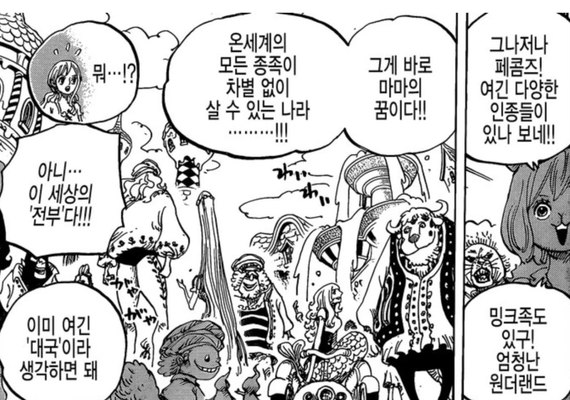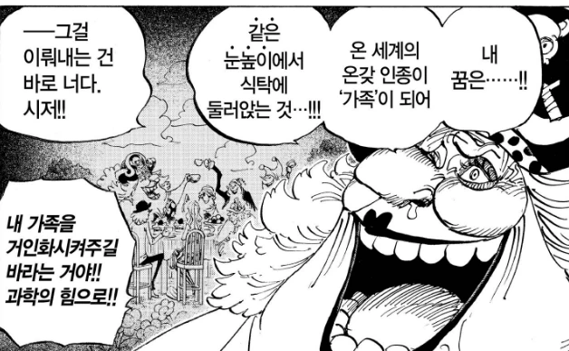 빅맘은 어떤 의미로 원피스와 가까운 인물입니다. 자신의 꿈은 "온 세상 사람들을 가족으로 만들고 한 식탁에 앉는 것"이라고 대놓고 이야기하죠.