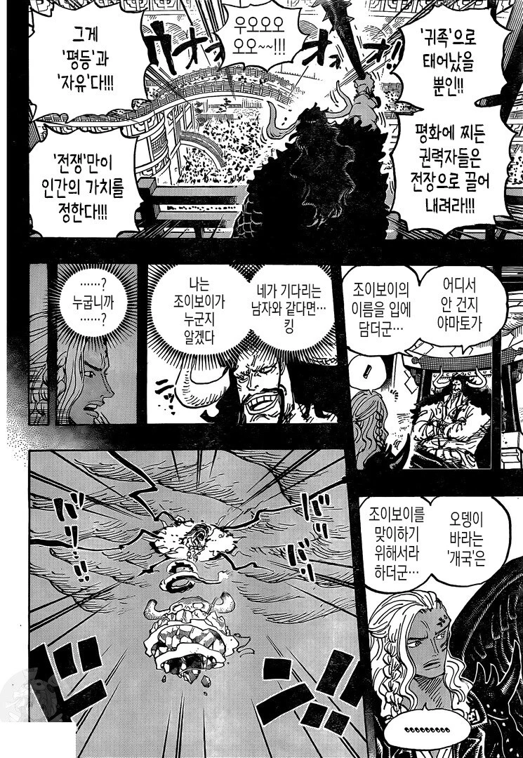 카이도는 세계를 바꾸려고 하고, 평등과 자유라는 가치를 모르지 않습니다. 다만, 그것을 이루는 방식을 "전쟁"이라고 생각하고 있죠. 말하자면 약육강식 무정부주의(아나키즘)입니다. 만인의 만인에 대한투쟁이 무한히 계속되는 야생의 상태를 이상적인 세상으로 그리고 있습니다. 그래서 해적단 이름을 백수(Beasts pirates)라고 짓고 모든 인원을 동물계 능력자로 만들려고 했던 것입니다.