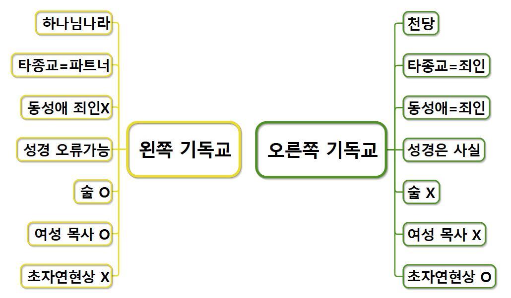 앞서 말했듯 교파와 신자들의 성향을 무 자르듯 나눌 수 있는 것은 아니다. 그러나 큰 틀의 기준을 갖고 있으면 내가 속한 교회(혹은 저 교회)의 입장은 좌우 중 어디에 가까운지 분별할 수 있게 되고, 또 자신의 성향과 가까운 교단을 찾을 수 있게 된다. 기독교인은 대체로 몇 교회 다녀보지 않았기 때문에, 또 비기독교인은 대중매체를 통해서만 기독교를 접하기 때문에 기독교에 대해서 한 가지 인상만 갖기가 쉽지만, 실제론 폭넓은 스펙트럼의 교회들이 존재한다.