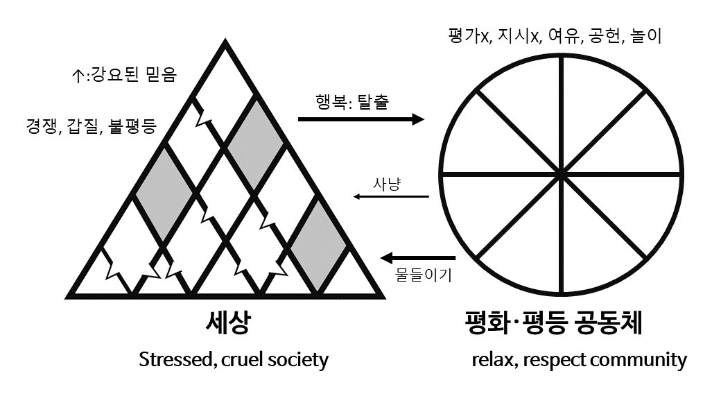 이때 공동체는 정신 차리라고 그거 하다 불행해진다고 상기시켜준다. 그렇게 공동체는 서로 연결되어 정체성을 유지한다. 이 공동체는 그 구성원을 끊임없이 세상에 파견하면서 세상을 물들여간다. 이것이 해피바이러스 프로젝트. 이 프로젝트를 위해 정기적으로 만나 공통의 지향을 확인하고, 세상에서 일어난 일을 묻고, 같이 명상하고, 존중을 담은 소통방법을 배우고, 책을 읽으며 공부한다. 이 탈출한 사람들의 공동체를 기독교에서는 교회라고 부른다.