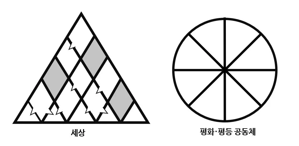해피바이러스 프로젝트의 목표는 각 사람들을 변화시킴으로써 피라미드에서 가시를 제거하는 것이다. 피라미드를 원으로 만드는 건 아니다. 세상은 세상의 원리가 있고, 종교단체는 종교단체의 원리가 있다. 세상엔 소득의 격차가 있고, 직장엔 위계질서가 존재한다. 그래야 시장이 돌아가고 조직이 일을 할 수 있다. 하지만 소유에 따라 사람을 차별하고, 직무상 위계가 인격의 위계가 되는 것은 부당하다. 이 공동체가 원하는 건 세상에 무시도 비교도 갑질도 사라지고 직무상 위계가 더 이상 인격의 위계가 되지 않는 것이다.
