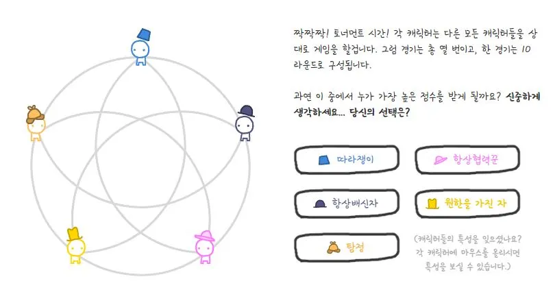따라쟁이는 협력으로 시작하지만 배신당하면 응징한다. 항상협력꾼, 항상배신자는 이름으로 설명이 충분하다. 나머지 둘은 신경 쓰지 않아도 된다.