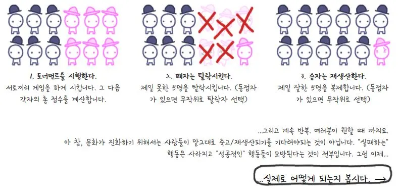 진화론의 개념을 차용한다. 적자생존의 원리에 따라서 점수를 적게 딴 5명을 멸종시키고 점수를 많이 딴 유전자를 5명 추가한다. 이 게임을 반복하면 누가 사회 전체를 장악하게 될까?