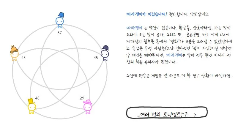 따라쟁이들끼리 도움을 주고받더니 순식간에 배신자들을 제압했다. 배신자들끼리는 서로 협력할 수 없지만, 따라쟁이들끼리는 서로에게 협력꾼이나 다름없다.