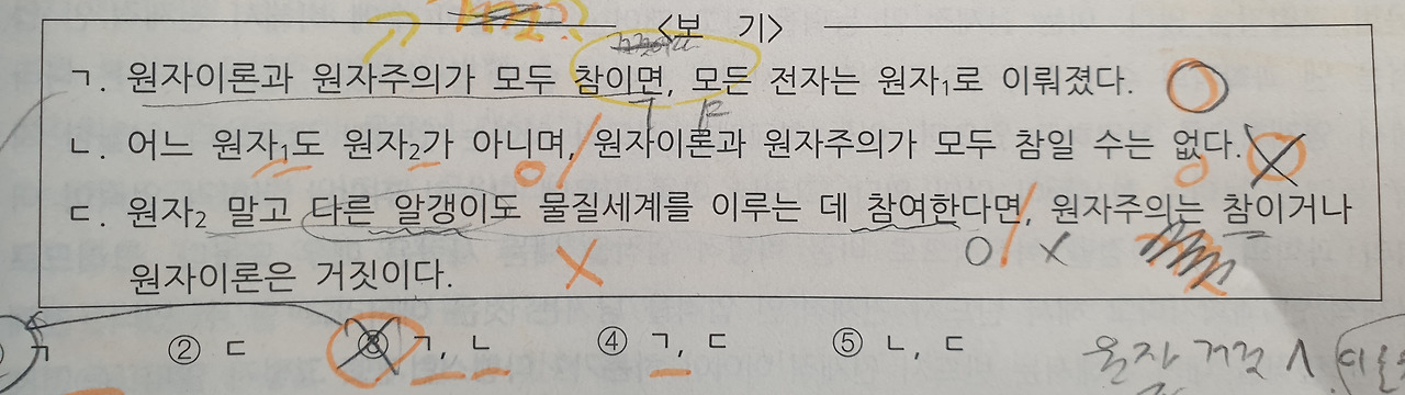 "원자주의가 거짓이고 원자이론이 참이면, 원자2말고 다른 알갱이는 물질세계를 이루는데 참여하지 않는다." 훨씬 낫죠?