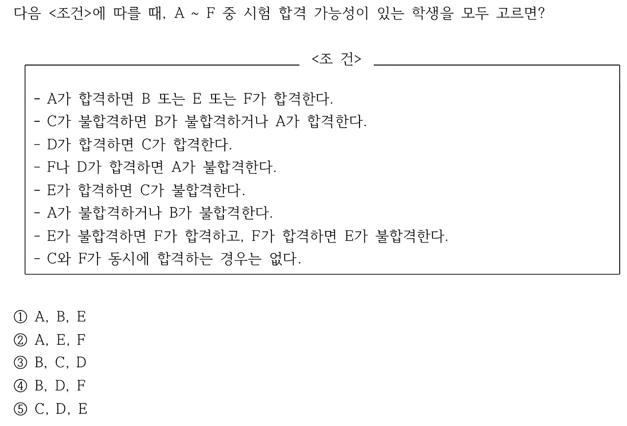 또 "보기와 같은 조건문이 지문에 있었나? 후건으로 귀결된다는 말이 지문에 있었나?" 하고 스스로 질문해봅시다. 보기의 조건문이 참이려면 결국 그 문장 자체가, 혹은 후건의 부정이 전건인 조건문이(대우), 지문에 있어야 하기 때문입니다. 네? 보기의 후건이 지문에서 전건으로 나왔다구요? 속지마세요 그 보기는 거짓입니다!!