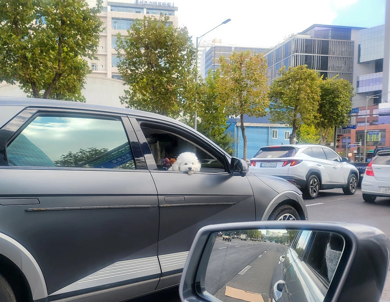 아침운동 가는 길에 차창문 밖 건너편 차창문으로 마주한