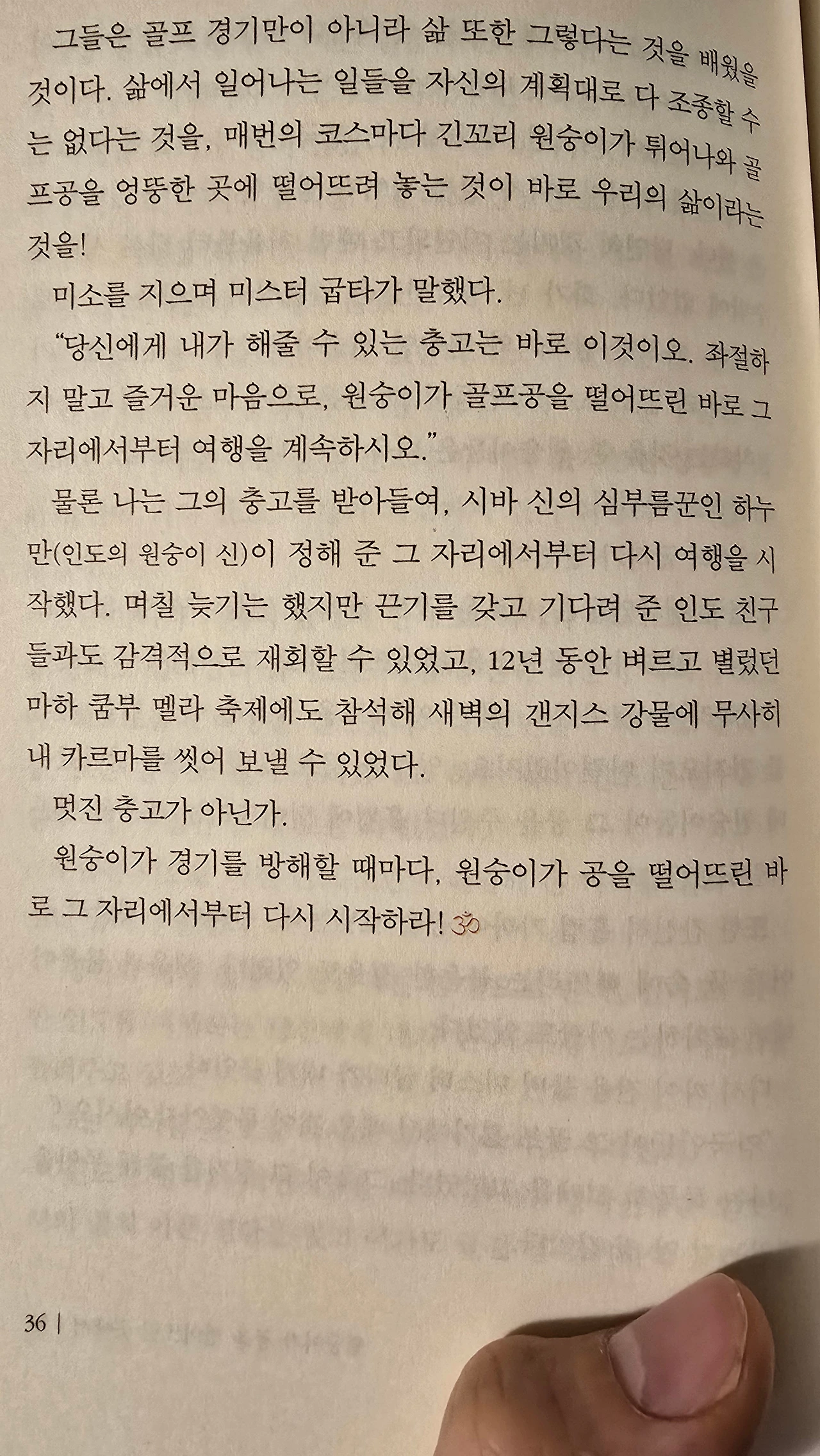 "삶에서 일어나는 일들을 자신의 계획대로 다 조종할 수 없다는 것을, 매번의 코스마다 긴 꼬리 원숭이가 튀어나와 골프공을 엉뚱한 곳에 떨어뜨려 놓는 것이 바로 우리의 삶이라는 것을!