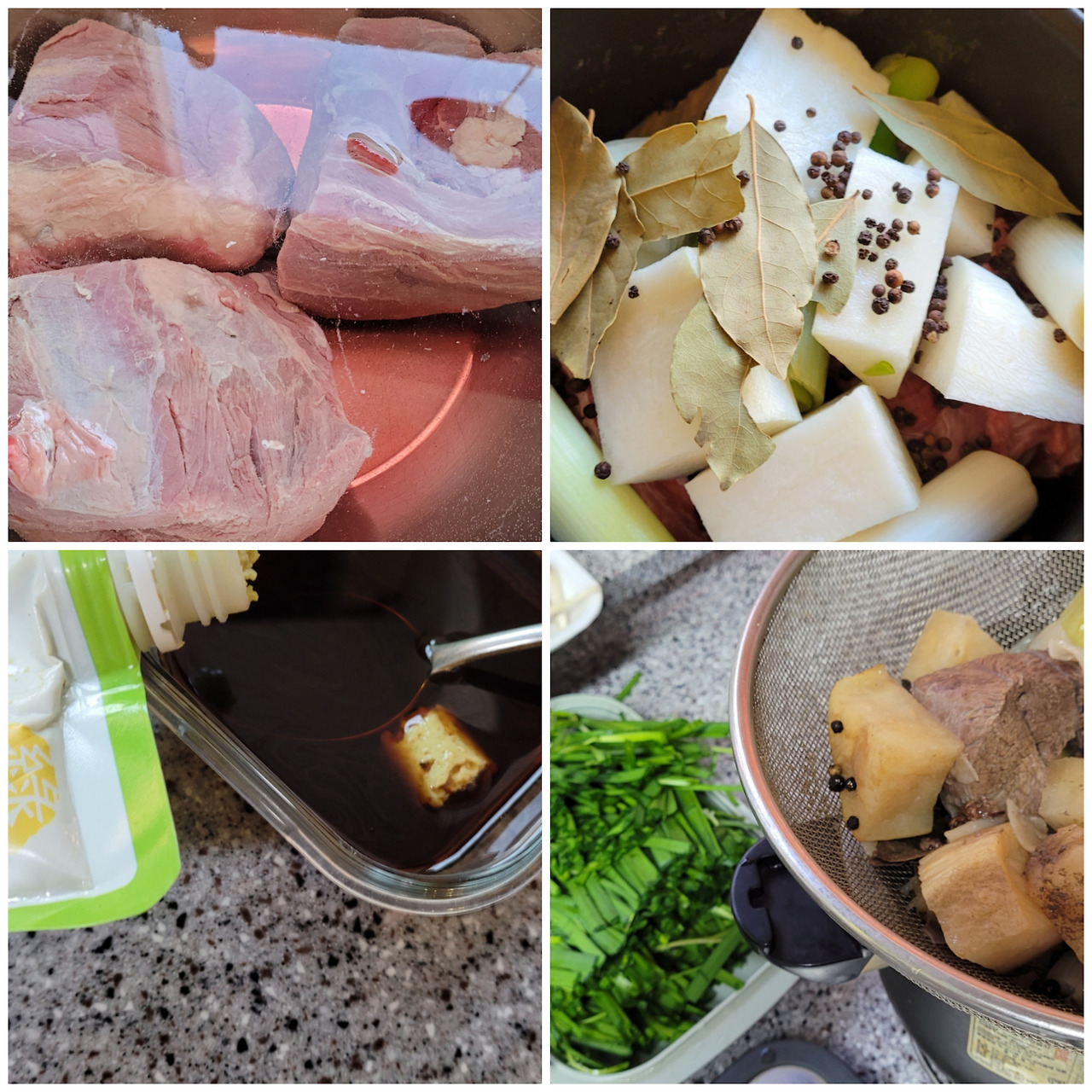 3. 압력밥솥에 아롱사태를 먼저 넣고, 채소류를 넣은 뒤에 월계수잎 몇 장과 통후추를 넣습니다.