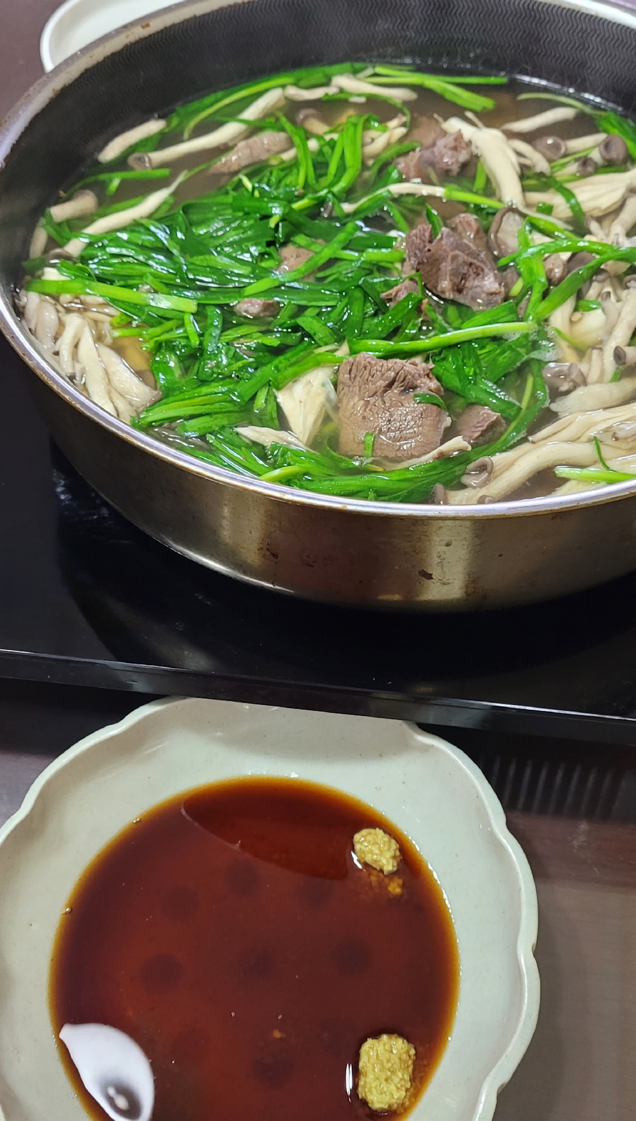 8. 냄비에 사태 넣고 육수 부운뒤에(자작하게) 부추와 버섯을 올린 뒤에 국간장 1스푼 넣고 끓인 뒤