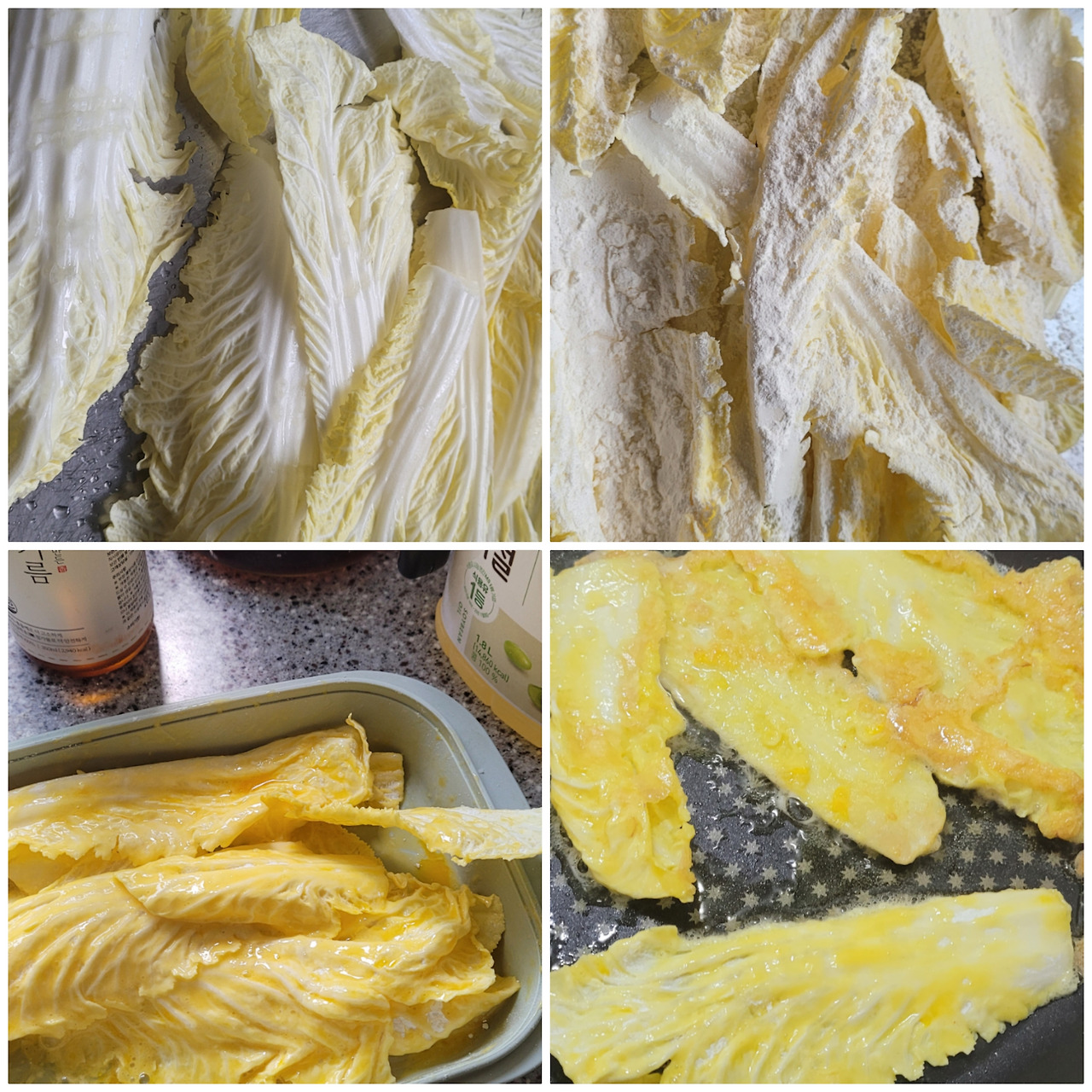 저는 밀가루옷을 따로 개지 않고 가루로 묻혀서 털어내고 계란물 입혀 살짝 부치는데요. 식감이 아주 좋습니다. 들기름 특유의 고소한 향이 알배추와 너무 잘 어울린답니다. 입이 심심하실 때 부담 없이 부쳐 드세요.