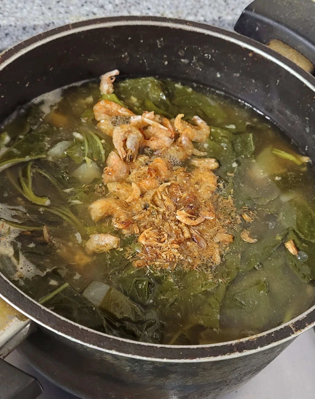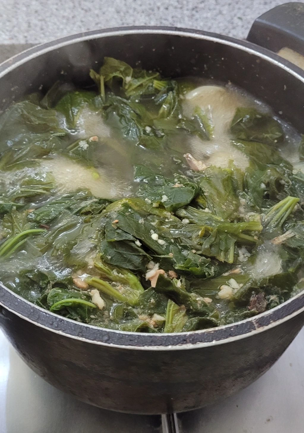 육수 낸 재료는 건져내고 약간의 된장과 아욱, 청양고추, 간 마늘, 양파 반 개를 넣고 끓입니다
