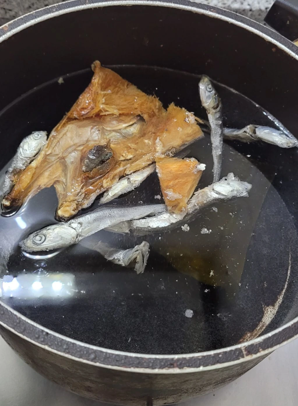 북어대가리, 굵은 멸치, 다시마 넣고 육수를 먼저 내세요