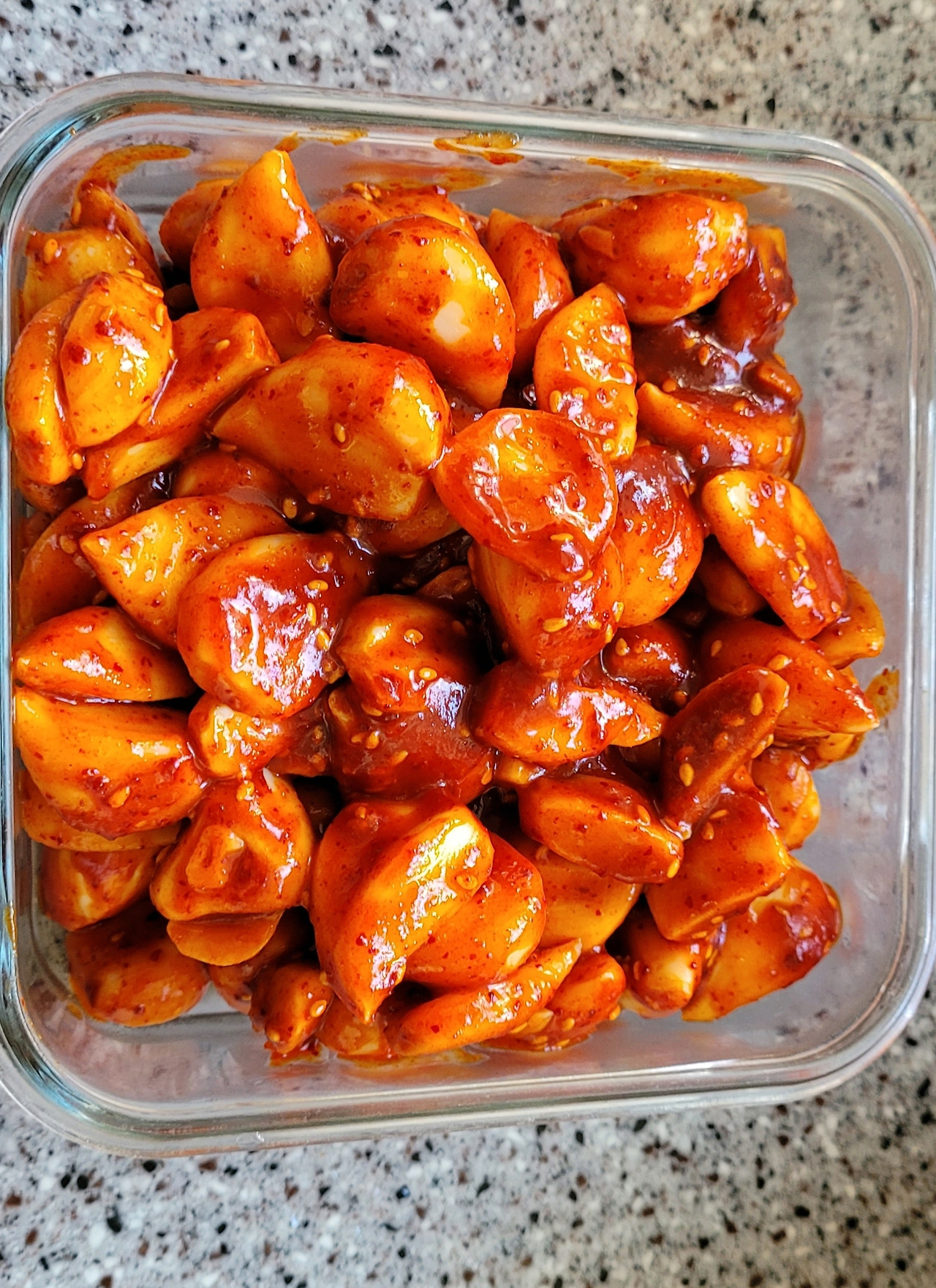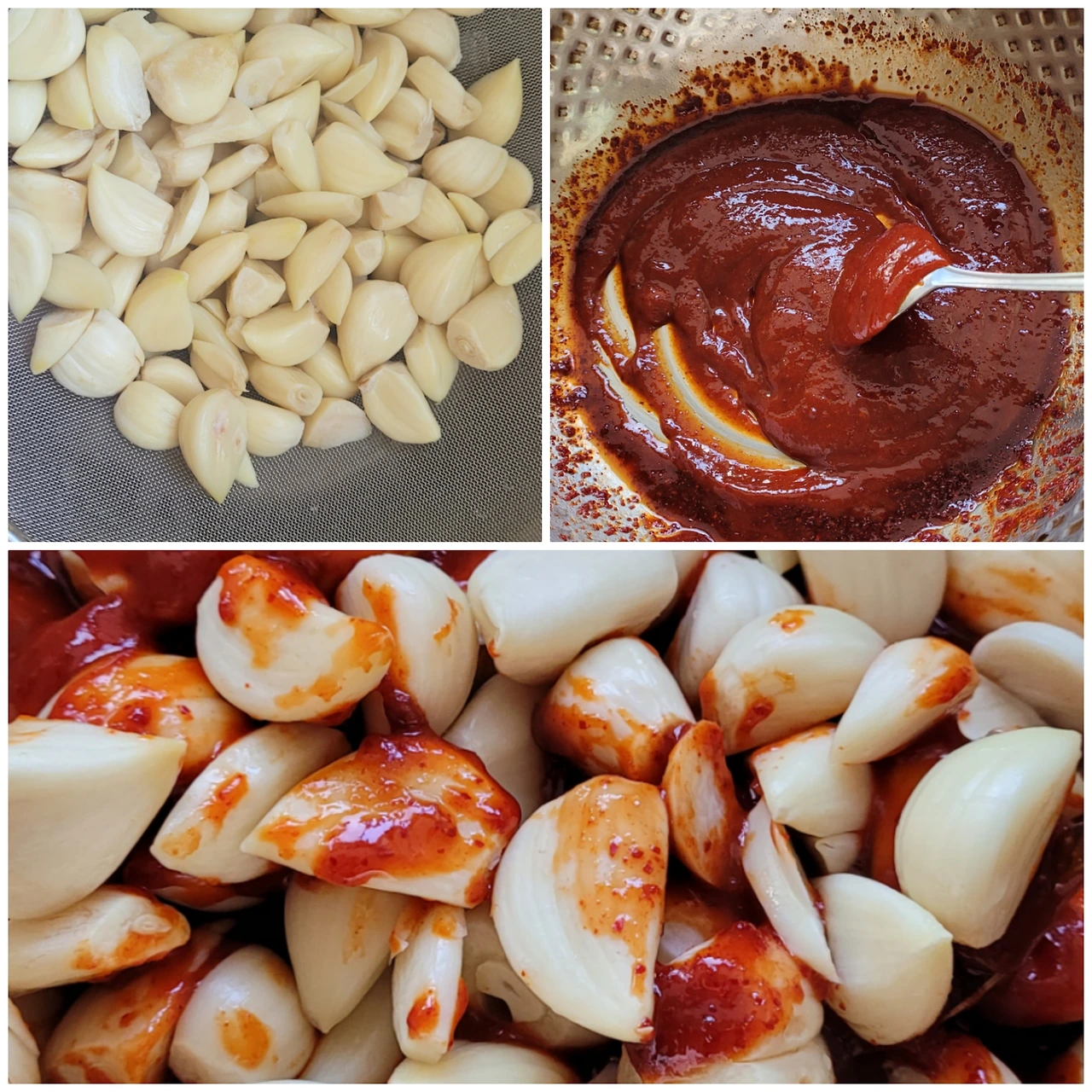 마늘이 좋긴 하지만 덥석 생으로 먹기엔 망설여진다면 데쳐서 드셔보세요. 마늘은 생으로 먹는 것보다 오히려 굽거나 데처 먹으면 생것보다 영양소가 더 증가한다고 알려져 있답니다. 데쳐서 요리를 하시면 아린 맛도 없으면서 바삭한 식감과 고추장의 들큼한 맛과 너무 잘 어울려요. 한 수저 듬뿍 퍼서 드셔도 부담 없어 좋아요.