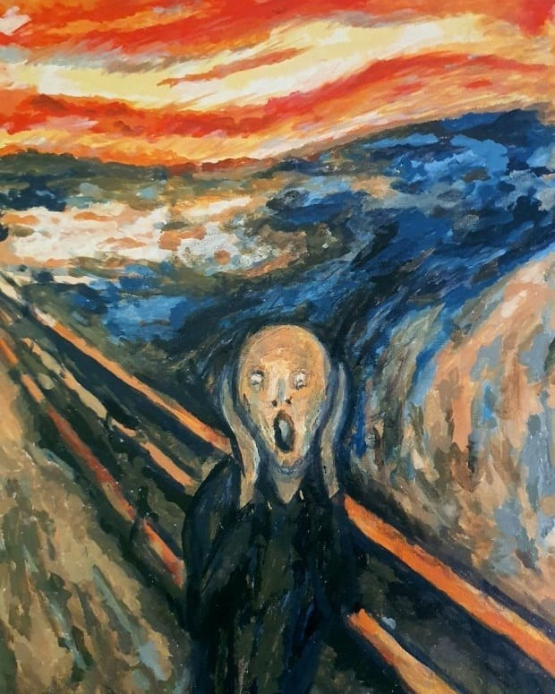 "나는 두 친구와 함께 길을 걷고 있었다. 해가 지고 있었고 약간의 우울한 기분이 들기도 했다. 그때 갑자기 하늘이 핏빛으로 물들었고 나는 불안으로 몸을 떨며 서 있었다. 그 순간 자연을 꿰뚫는 거대하고 끝없는 절규가 들리는 것 같았다." - 뭉크