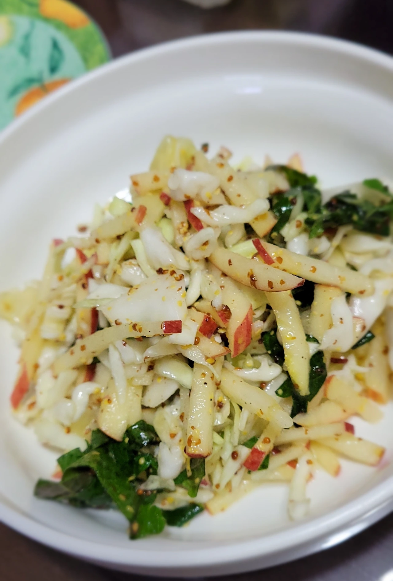 양배추, 사과 샐러드는 식이섬유가 풍부해서 장운동을 활발히 해주고 해독작용이 있다고 알려져 있습니다.