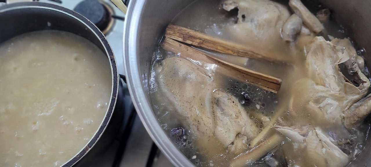 1. 깨끗이 씻은 영계닭을 끓는 물에 넣어 불순물이 올라오면 버린 뒤, 새 물에 닭과 재료들을 모두 넣고 끓입니다. 끓이는 시간은 화력에 따라 다르겠지만 저희 집은 거의 부서질 정도로 오래 끓여요. (2시간 이상)