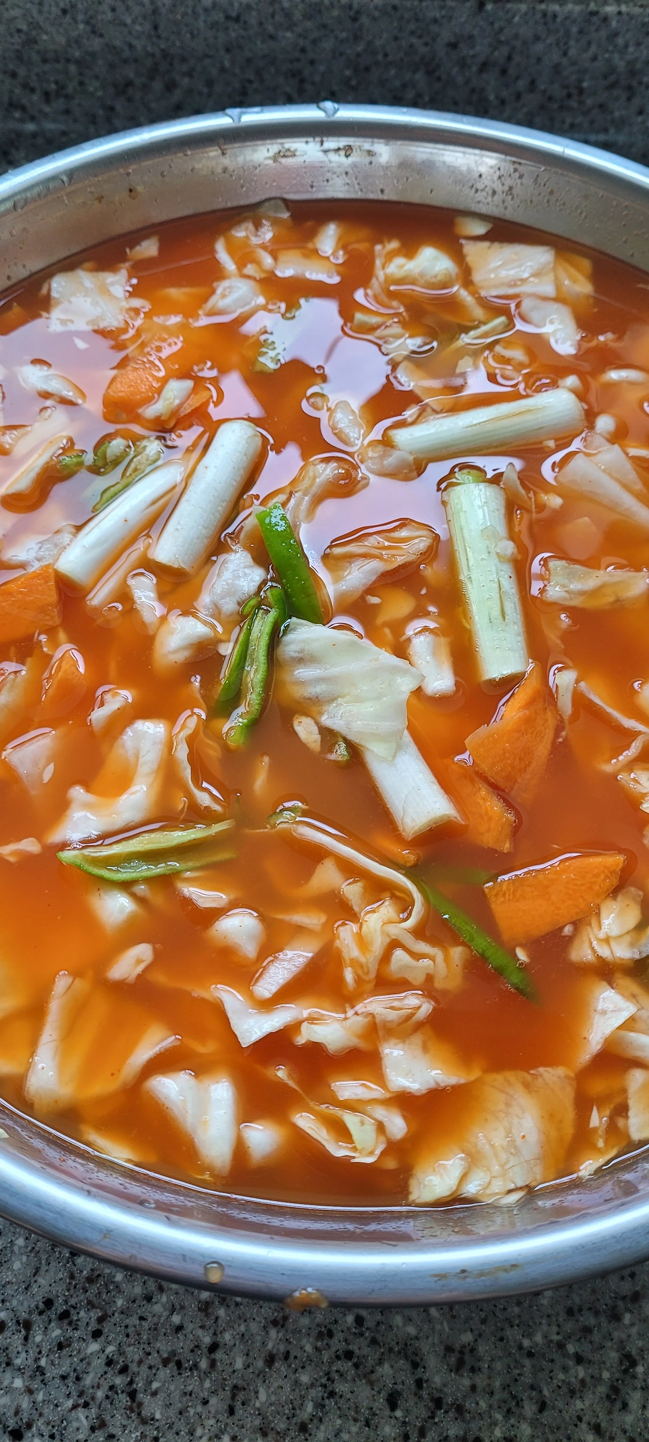 재료: 양배추 반통, 무, 청양고추, 당근 조금, 쪽파, 대파, 소금, 뉴슈가 조금