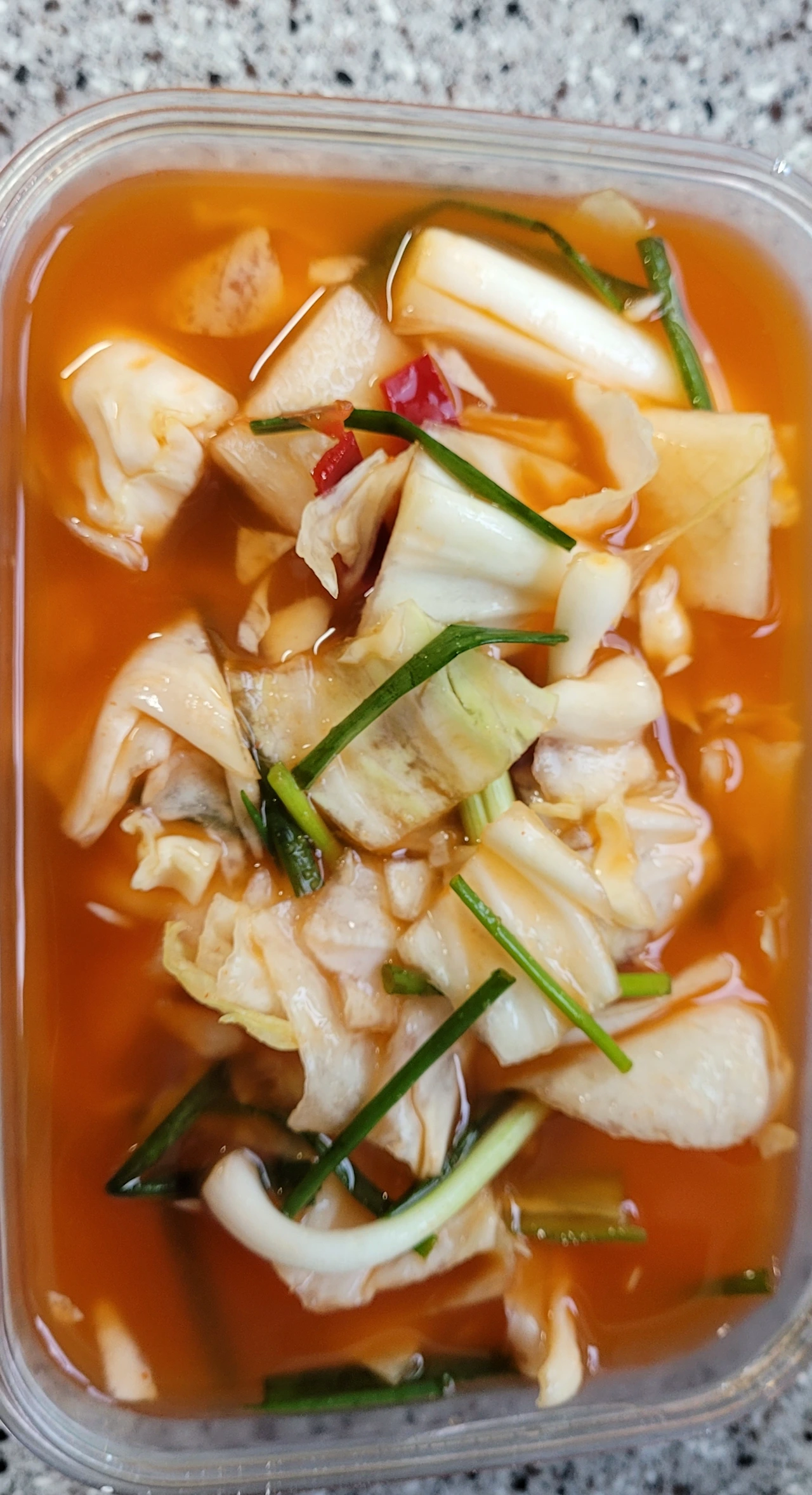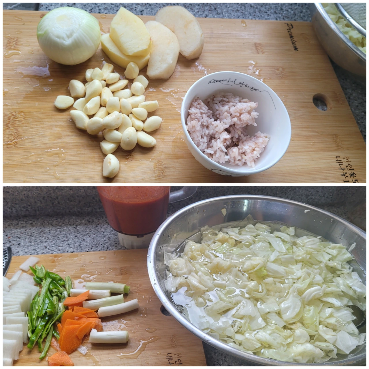 양념: 배, 사과 반 개씩, 양파 1개, 마늘 한 줌, 생강청 1T, 고춧가루 3T, 찬밥 3T, 물 500ml 넣고 믹서로 갈아두기