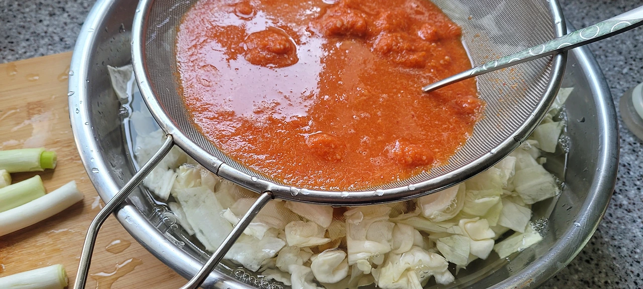 3. 소금에 절인 양배추 위에 물 3리터 붓고 믹서에 간 양념을 체망에 곱게 내려 줍니다.