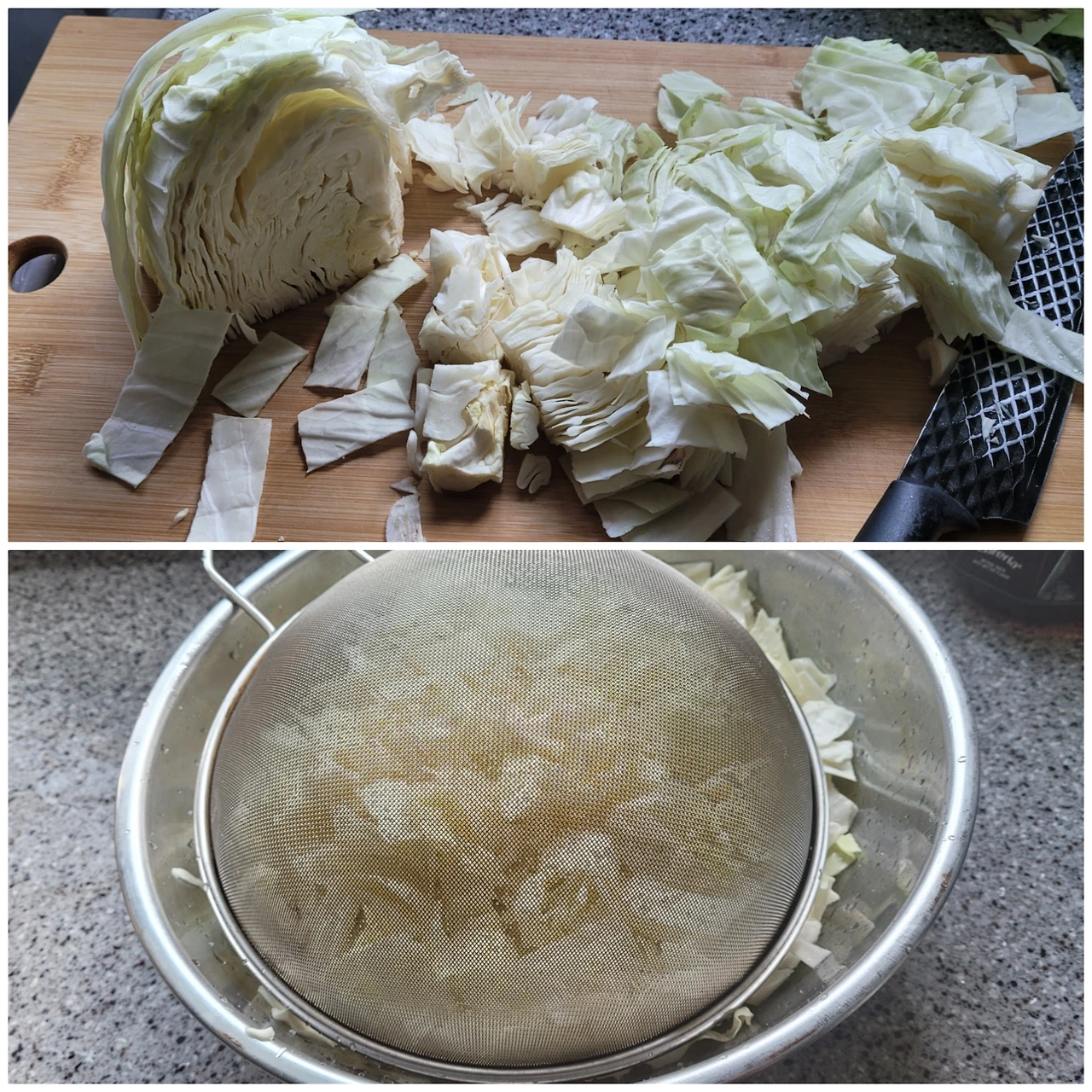 1. 양배추 반통은 네모지게 썬 뒤에 깨끗이 씻고, 소금 3T를 골고루 뿌린 뒤 40분 정도 절입니다.
