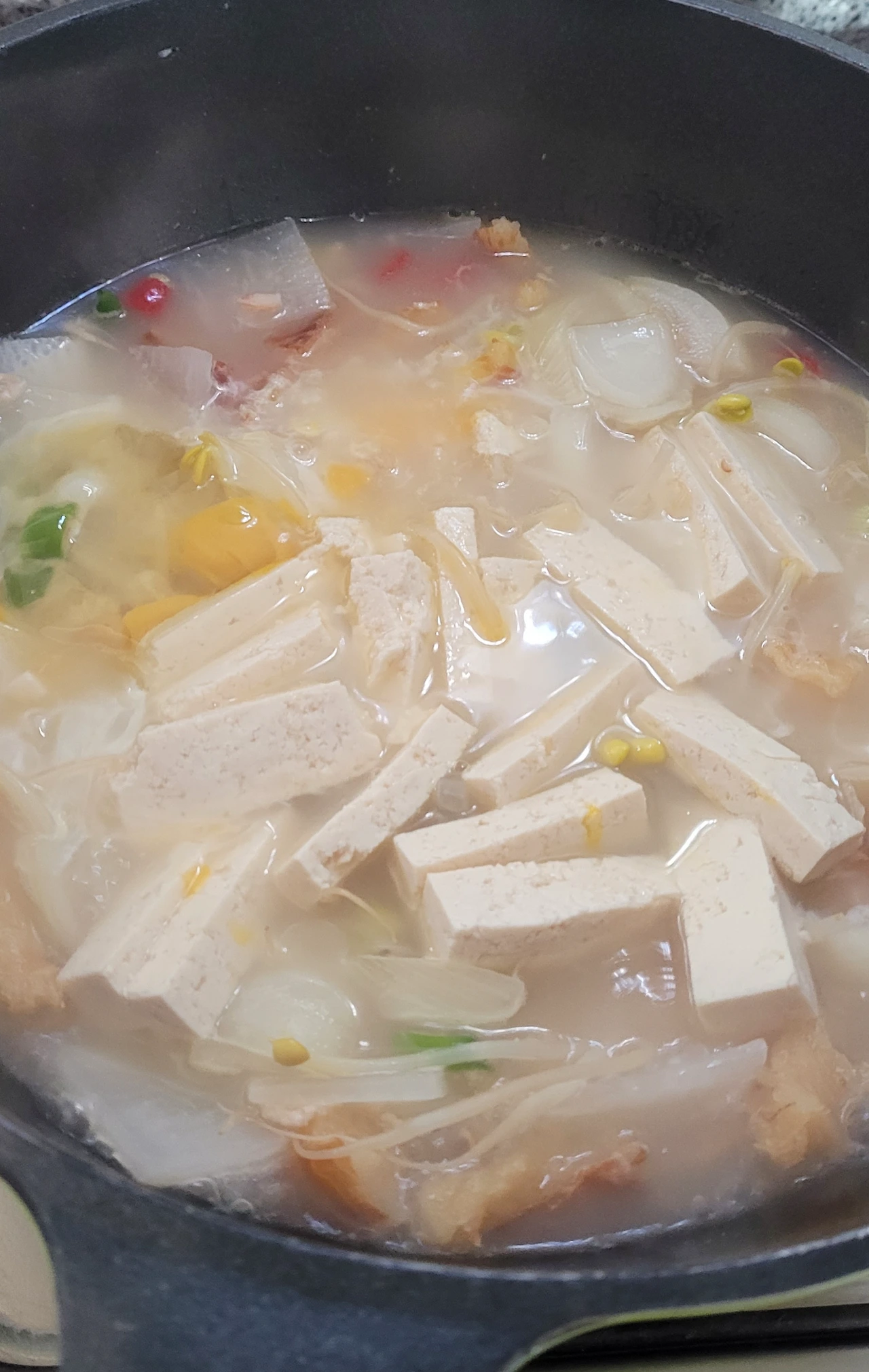 5. 먹기 직전에 두부 썬 것과 계란 한 개 풀어 넣어 한 소 뜸 끓인 후에 내놓으면 끝.
