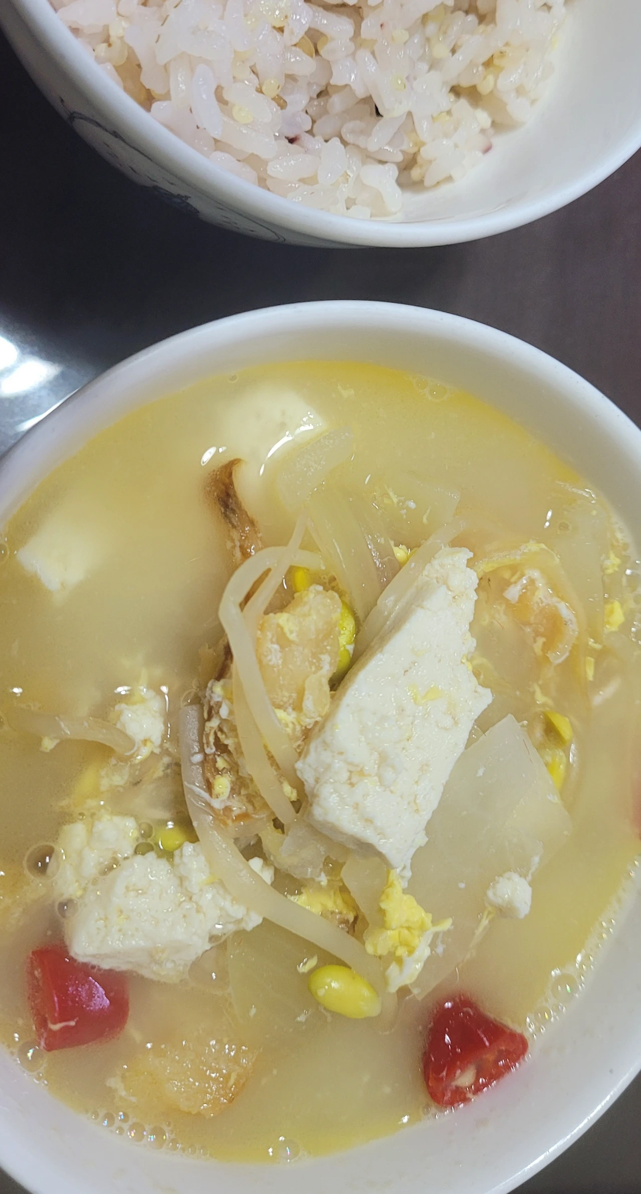 재료: 마른 북어채 한 줌(50g), 무 한토막(100g), 청양 고추 2개(홍, 청), 양파 반 개, 두부 반모, 계란 1개, 콩나물 한 줌, 들기름, 새우젓, 참치액