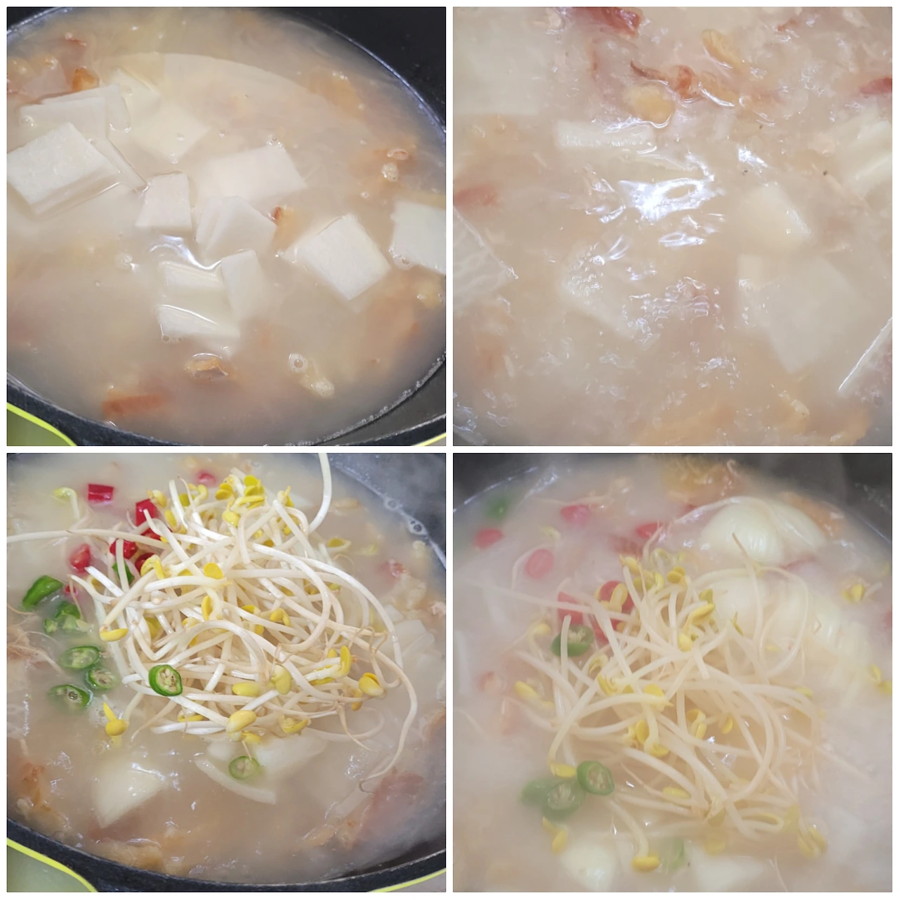 부재료: 마른 북어 채 50g, 무 100g, 청양고추 각 1개, 양파 반 개, 콩나물 한 줌(최종 사용하는 두부, 계란은 별도)