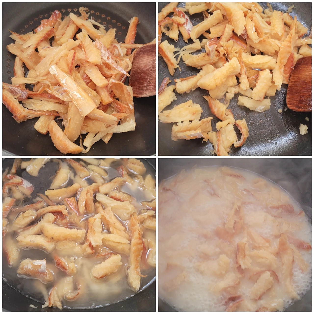 2. 북어가 기름을 먹고 통통해지면 물 한 대접 붇고 약불에 뭉근히 끓여주세요.