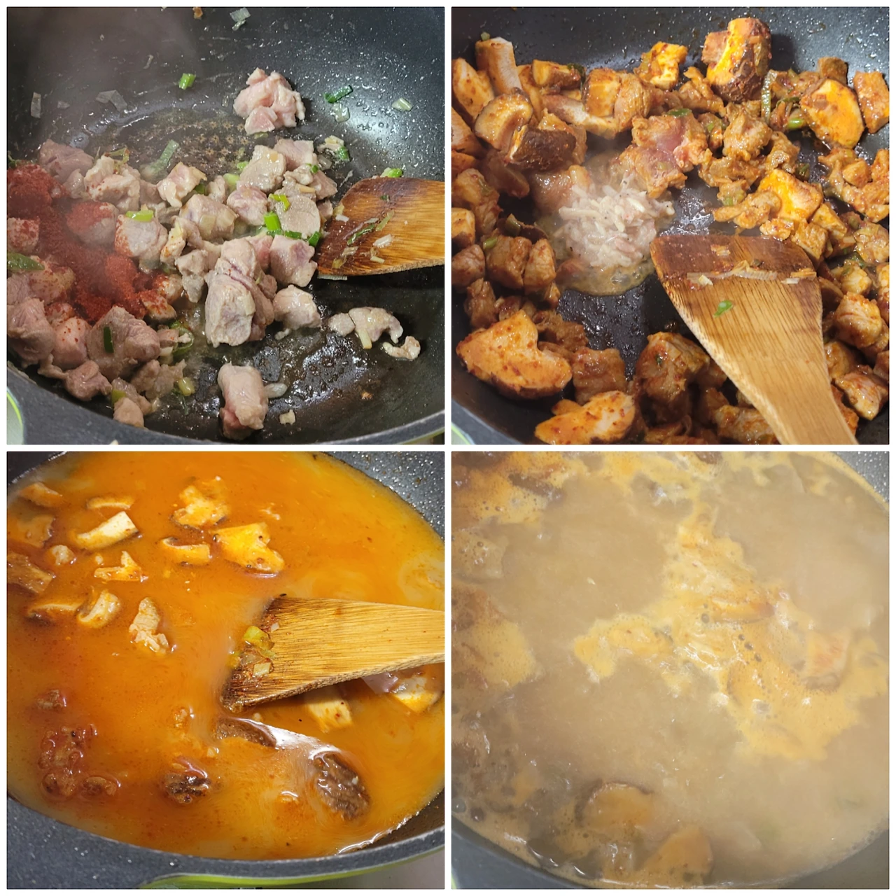 순두부찌개를 끓일 때 중요한 저만의 팁은 초반 돼지고기를 볶을 때 '새우젓'도 한 스푼 넣고 볶아 준다는 겁니다. 새우젓의 비린맛도 날리면서 돼지고기와 조화를 참 좋거든요.