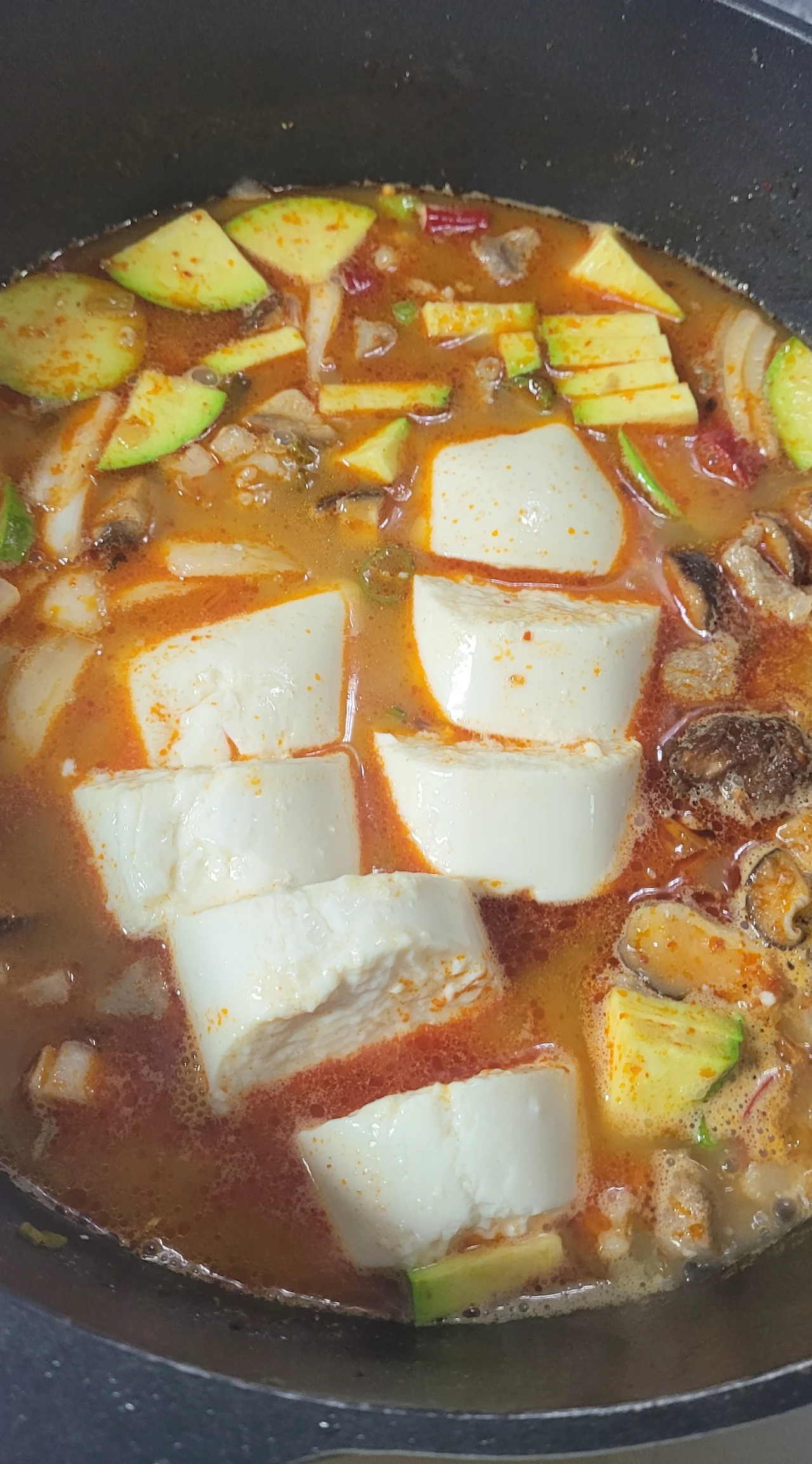 재료: 순두부 1봉(350g), 돼지고기 목살 100g, 대파 반대, 간 마늘 1T, 고춧가루 2T, 고추장 1/2T, 새우젓 1T, 청양고추 2개, 양파 반 개, 표고버섯 3개, 애호박 반개, 계란 1개, 참치액 1T, 참기름 1/2T, 식용유 1/2T