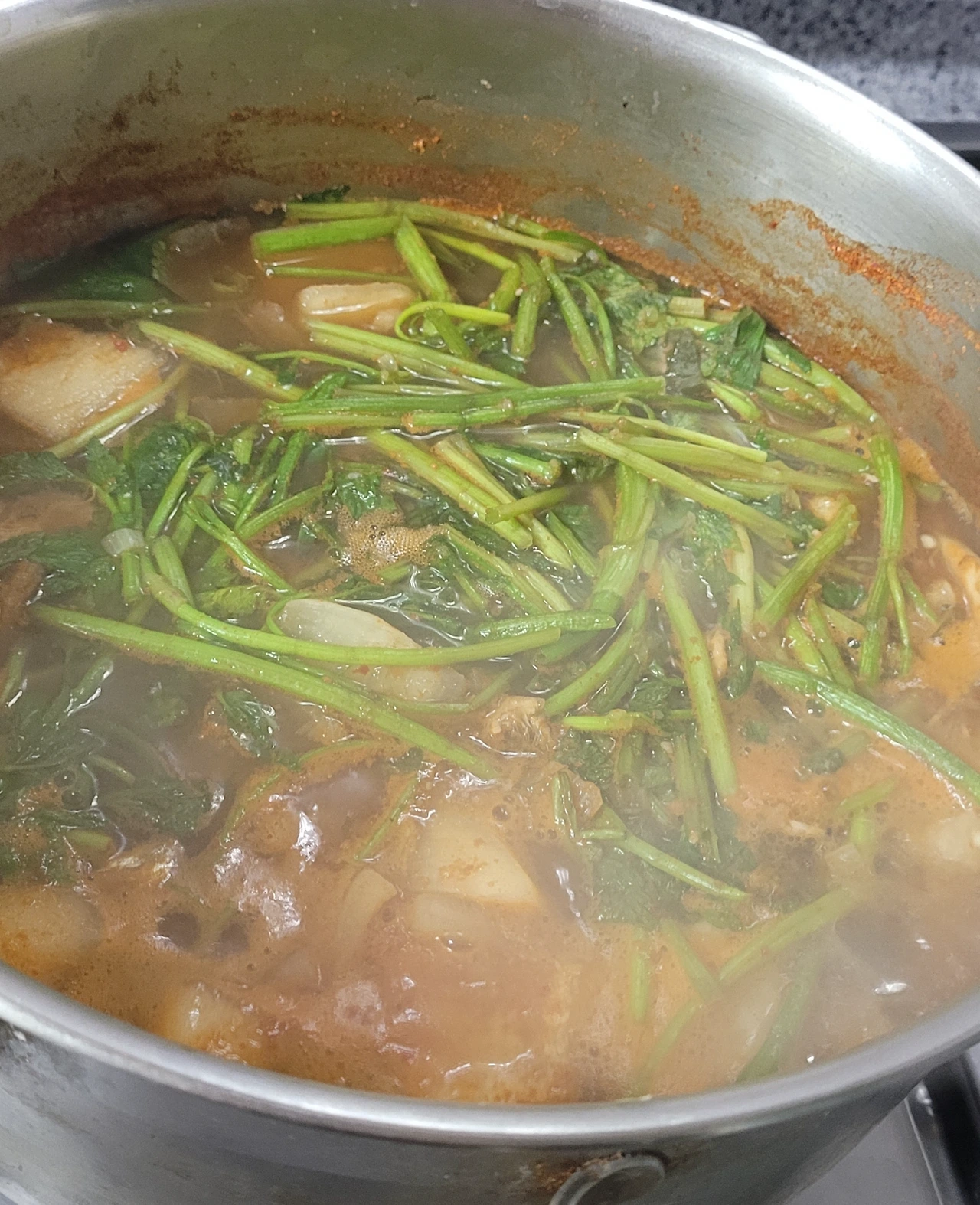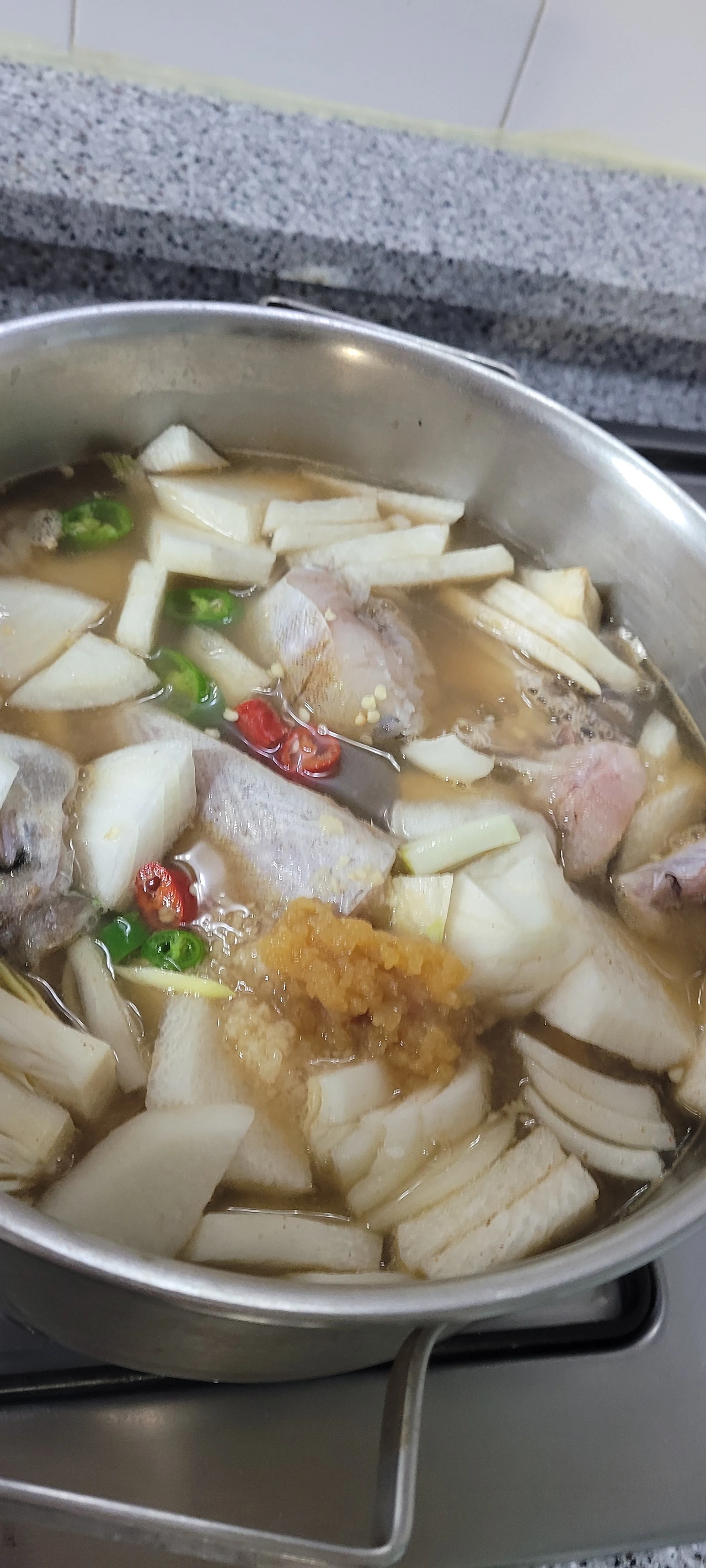 동태 특유의 비린내를 잡기 위해 맨 처음 된장을 넣고 끓이고 뚜껑을 끝까지 열고 끓이는 것이 팁입니다. 저는 이번에 미나리를 넣었는데, 쑥갓을 넣어도 잘 어울립니다. 식성에 맞게 야채 추가하시고 간은 적당히 가미하세요.