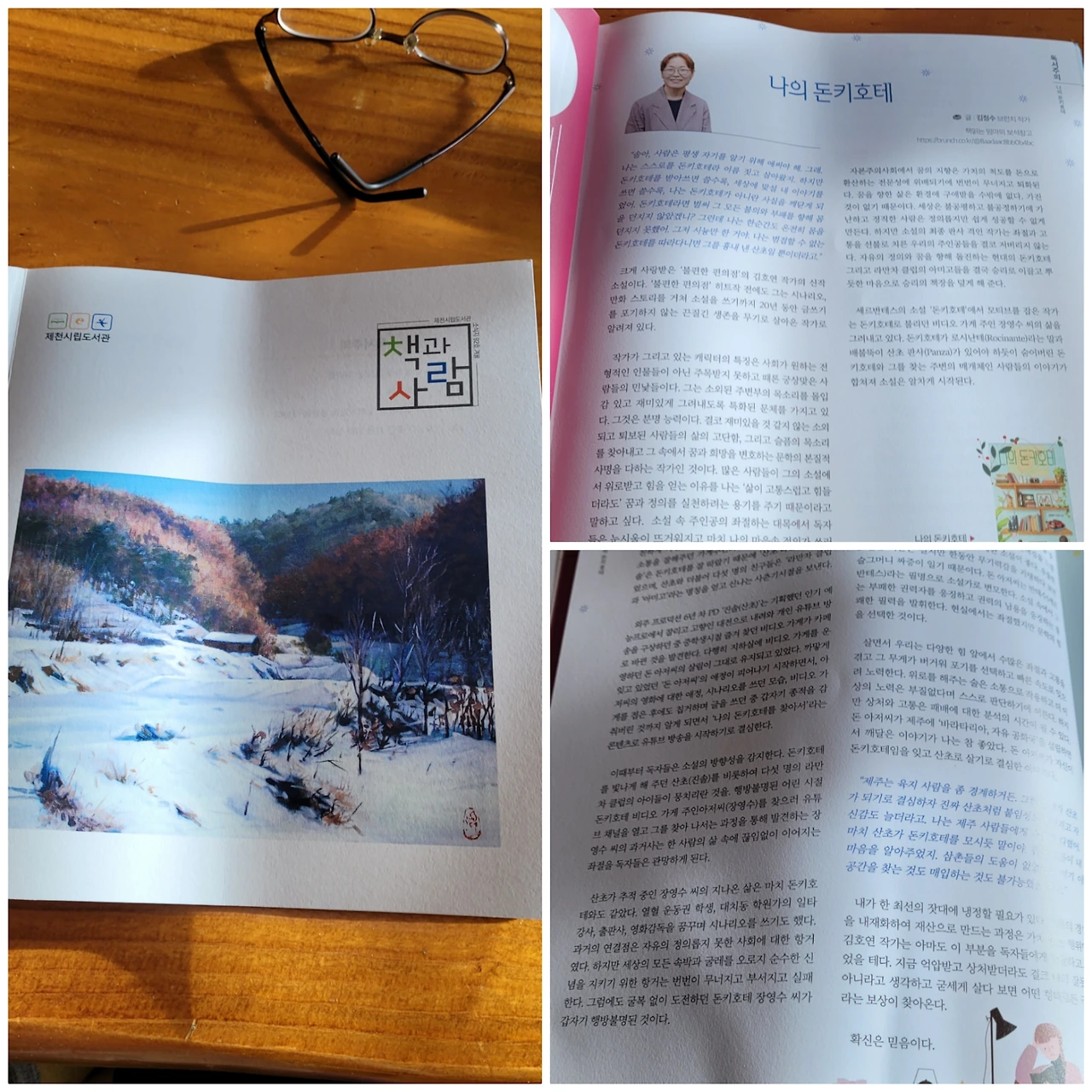 지난해 11월 말경, 브런치 플랫폼을 통해 제천시립도서관으로부터 제안메일이 왔었답니다. 도서관 소식지에 제 글을 올리고 싶다는 제안이었는데요. 거절할 이유가 없어 바로 수락을 해드렸는데, 오늘오후 우편함에 겨울호 소식지가 반갑게 꼽혀 있더군요. 제안메일이 왔을 때 솔직히 너무 기뻤습니다. 누군가 제 글을 읽고 공감을 하고 또는 누군가 서점에 들러 책을 덜 쳐 볼 것을 상상하니 흥분되었거든요.