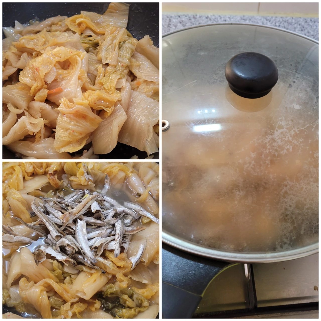 4. 강불로 볶다가 묵은지에 물기가 줄어들 즈음, 멸치 우려낸 물을 가운데 붓고 중불로 바꾼 뒤 김치로 덮어 줍니다.