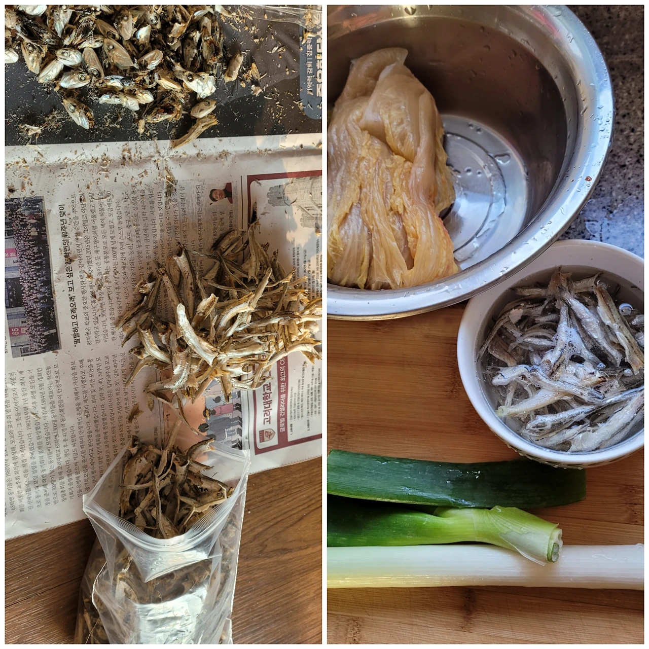 2. 다시 멸치는 전자레인지로 30초 돌려 습기를 없앤 후에 잠길 정도의 물에 담가 멸치육수를 만듭니다.