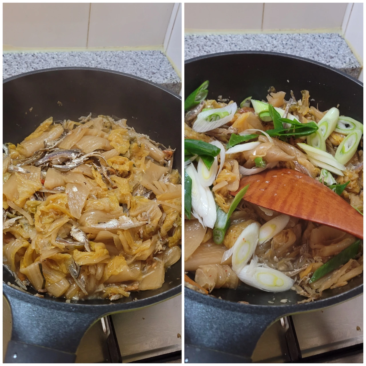 재료: 묵은지 반포기, 다시 멸치, 대파, 설탕, 미원, 미림, 들기름, 통깨