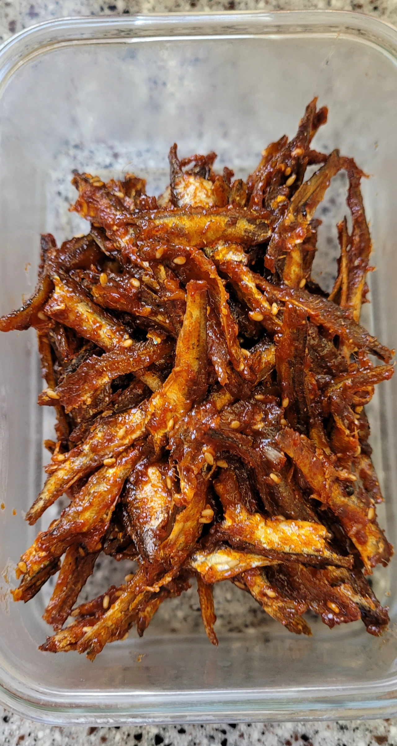 재료: 중간멸치 150g, 고추장, 간장, 미림, 올리고당, 설탕, 간 마늘, 참기름, 통깨