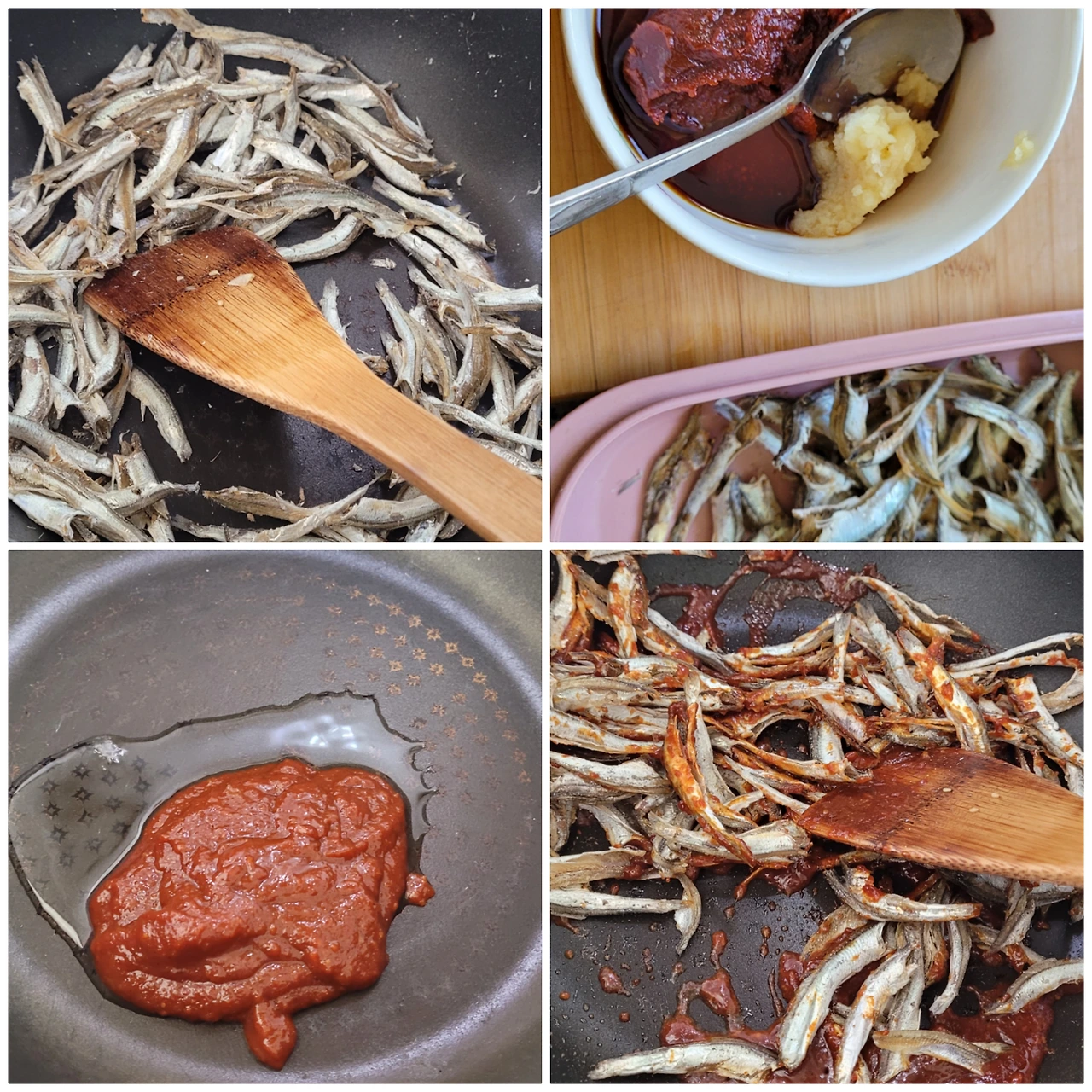 2. 깨끗한 팬에 식용유 2T 두른 뒤에 양념소스 넣고 볶다가 끓기 시작하면 덖어 둔 멸치를 넣고 30초 정도 양념이 섞이도록만 볶아 줍니다.