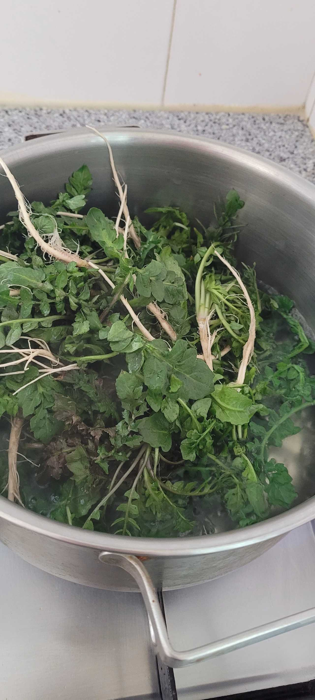 2. 끓는 물에 소금 넣은 뒤에 냉이를 넣고 30초 데치고 바로 찬물샤워를 해줍니다.