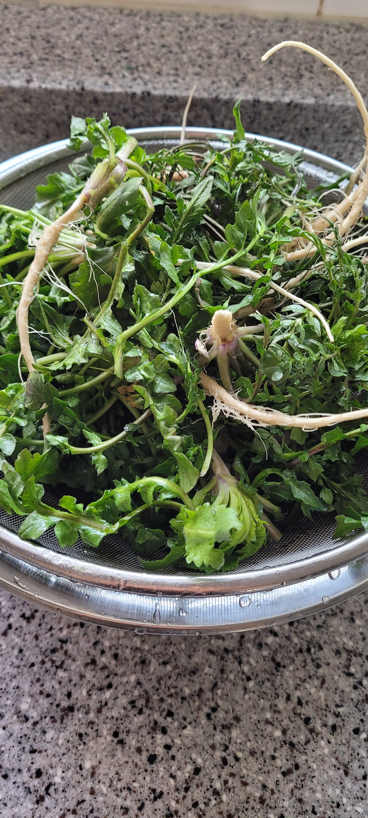 1. 냉이를 손질한 뒤에 깨끗이 씻어 줍니다.(뿌리와 잎 사이 부분을 각별히 손질합니다)