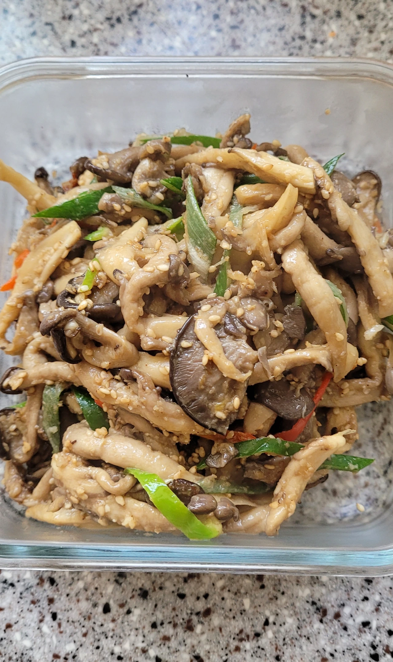 재료: 느타리버섯 300g, 간 마늘, 청양고추 4개, 대파 조금, 진간장, 굴소스, 참기름, 통깨