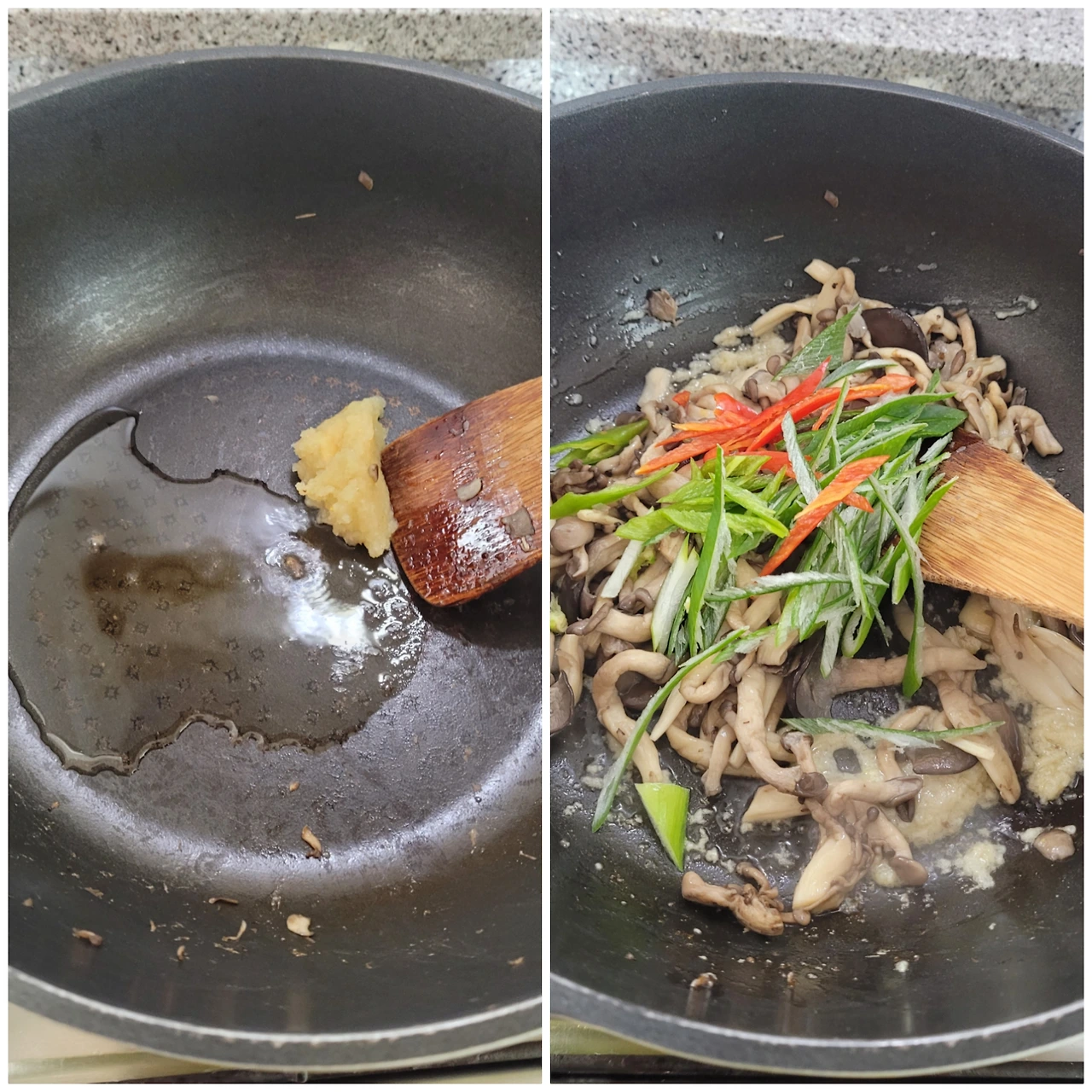 3. 웍에 식용유 1T, 참기름 1T를 두른 뒤에 간 마늘 1T를 넣고 볶다가 느타리버섯, 고추, 대파를 넣고 볶아줍니다.