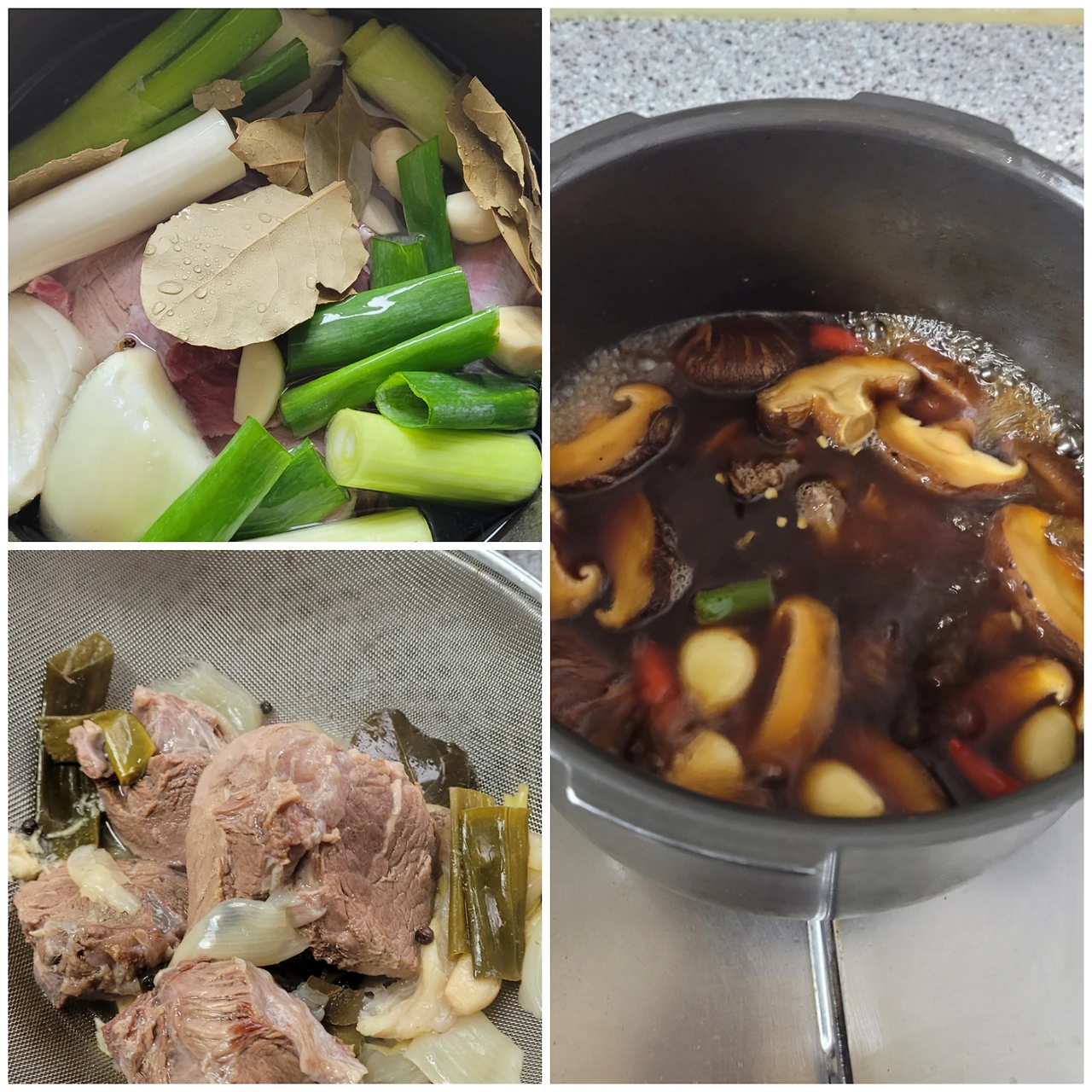 2. 압력밥솥에 사태를 넣은 뒤에 잠길 만큼 물을 붓고 양파 반 개, 대파 1대, 통마늘 10알, 통후추 조금, 월계수잎 몇 장 넣은 뒤에 불에 올립니다. 추가 움직이면 5분 그대로 두었다가 약불로 다시 5분 후 불을 끕니다.