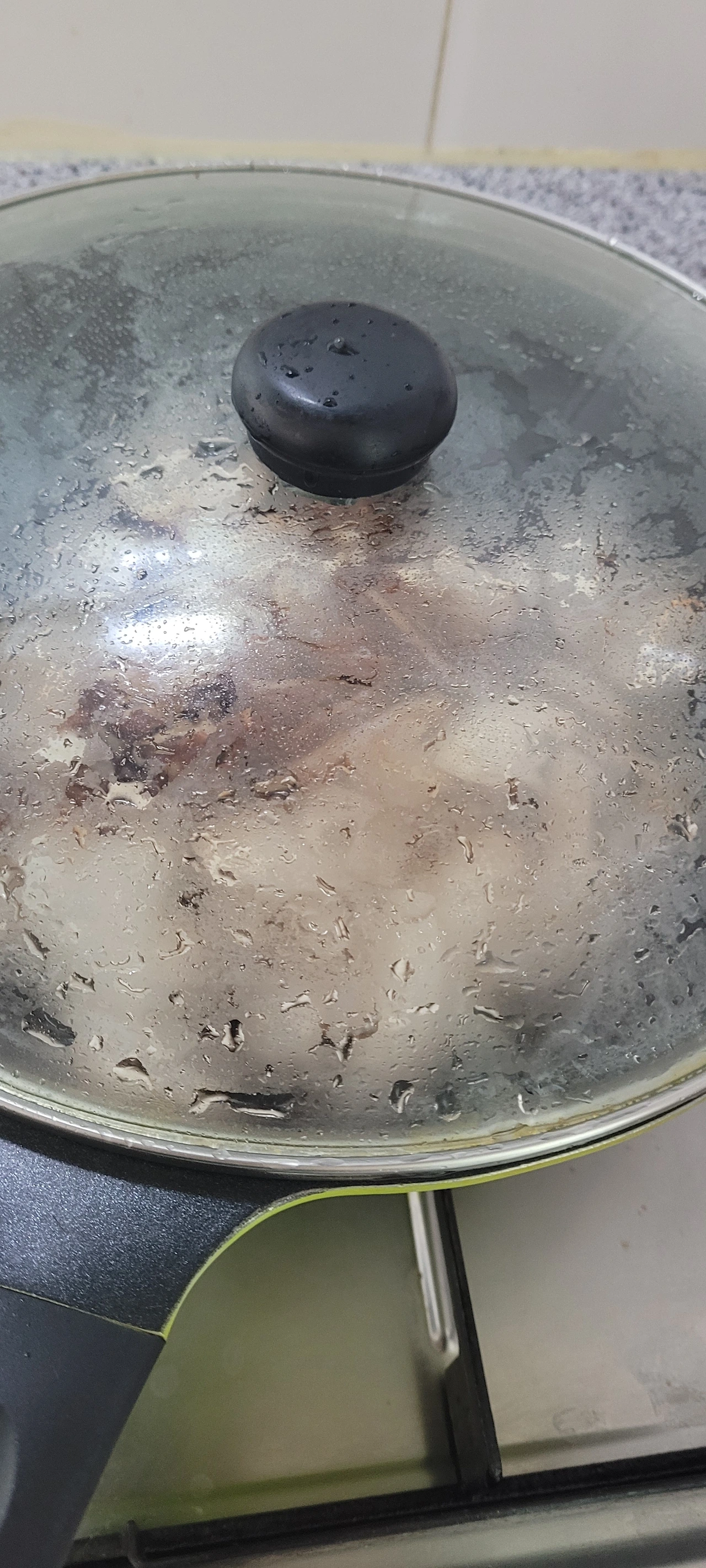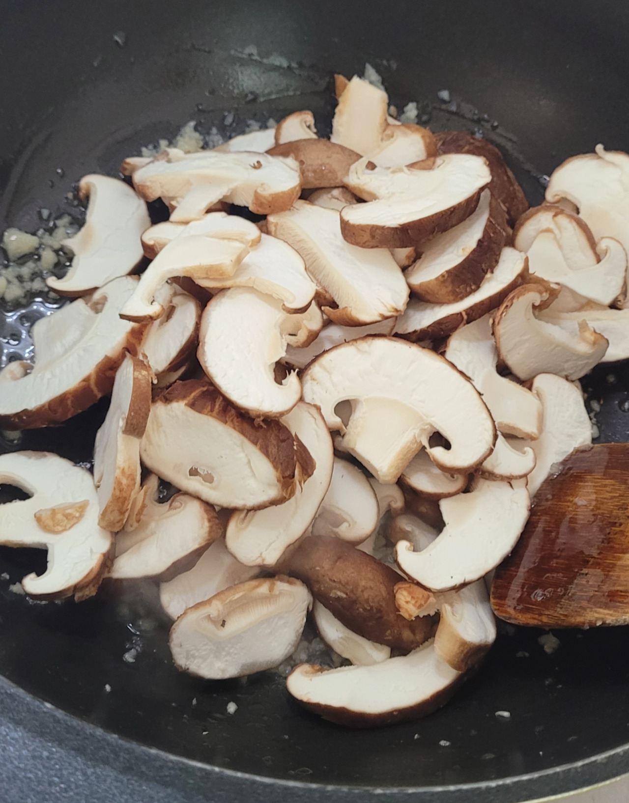 2. 깨끗이 손질한 표고버섯을 넣고 섞어준 뒤에 물 2T 넣고 뚜껑 닫아 약불로 익힙니다.